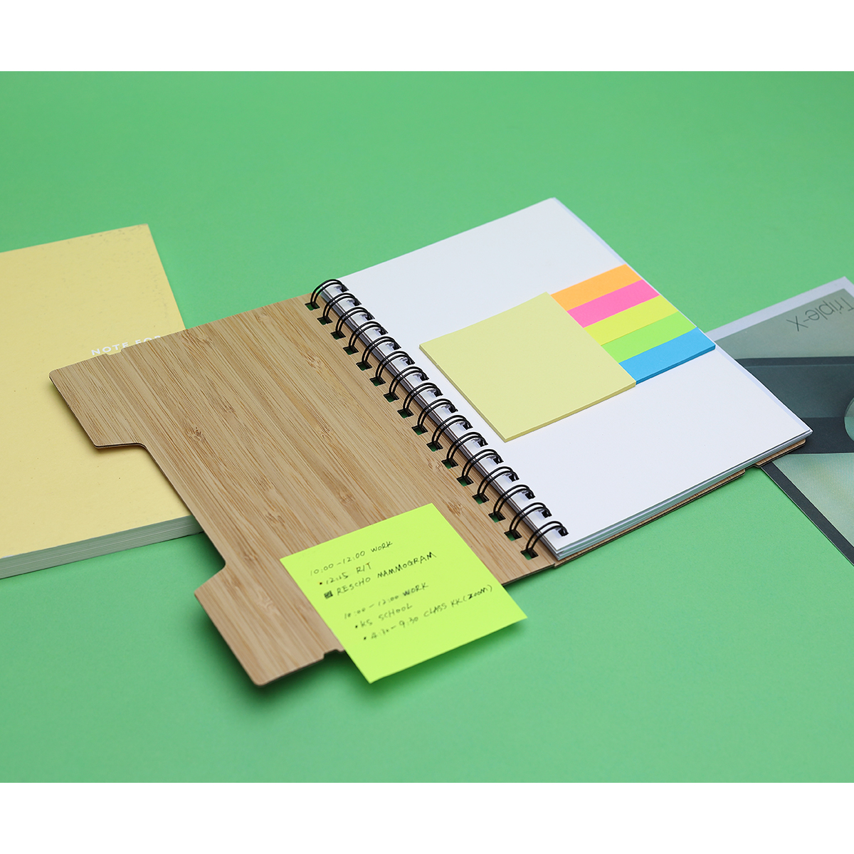 Libreta Pafos. - Libreta con pasta de bambú, espiral metálico, 60 hojas rayadas de 70 g, notas adheribles, 25 banderines adheribles en 5 colores y banda elástica negra sujetadora de pastas. Tamaño A5.