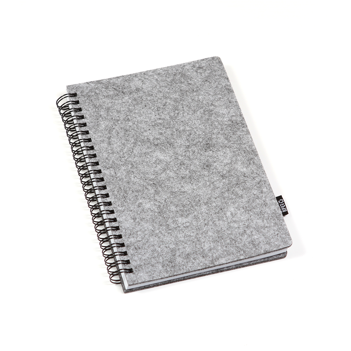 Libreta Bellaria. - Libreta con espiral fabricada en fieltro de RPET, con liga porta pluma, tamaño A5 con 80 hojas de 70 gramos cada una y páginas blancas rayadas.
