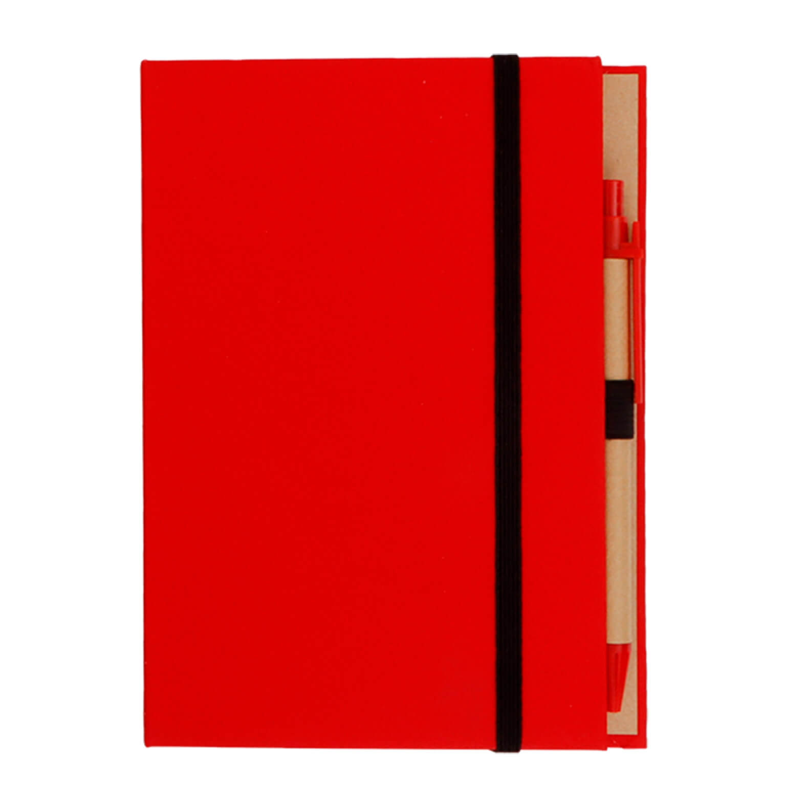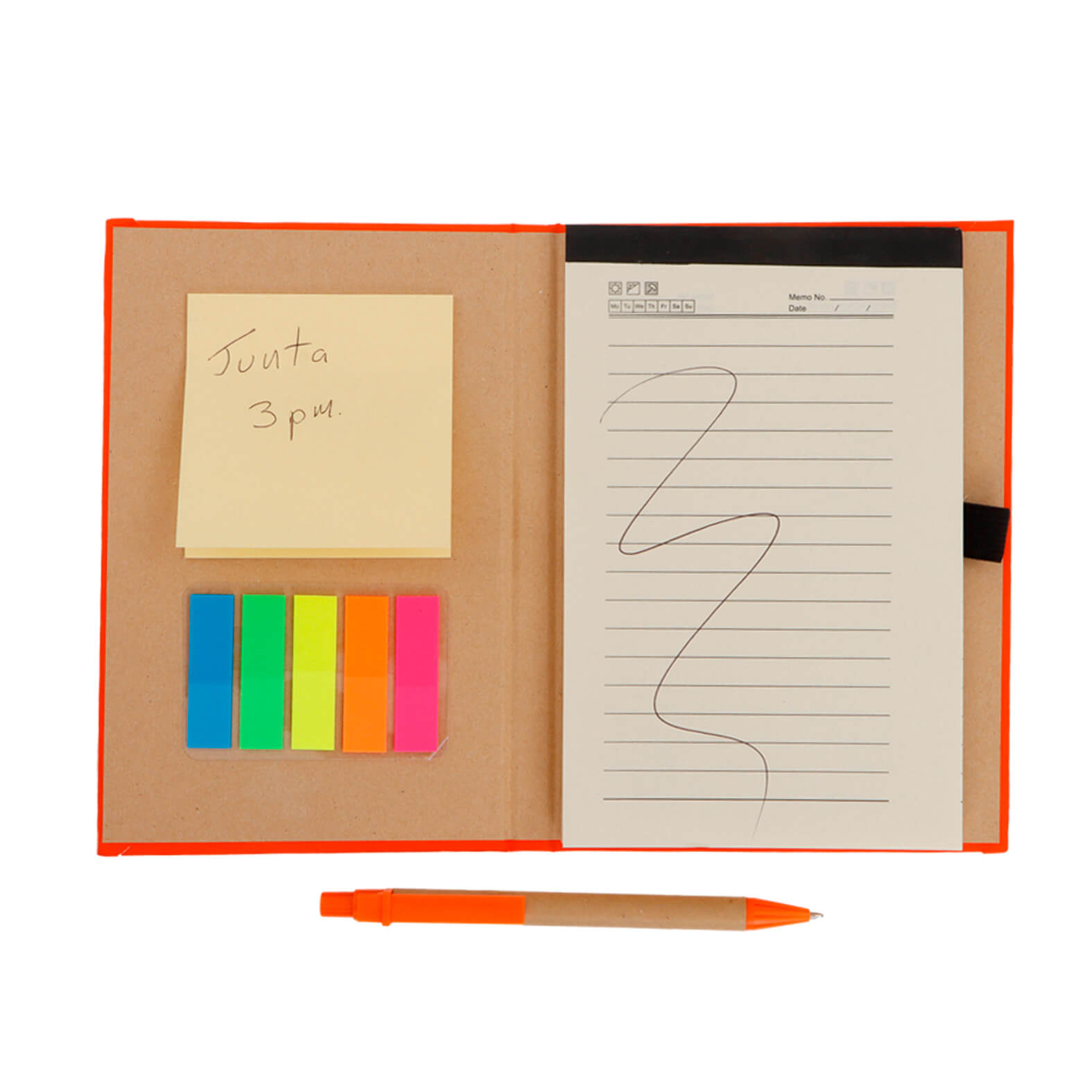 BIO Set ecológico con block de notas: Incluye un block de notas con 80 hojas rayadas, notas adhesivas, banderas adhesivas, bolígrafo y banda elástica.