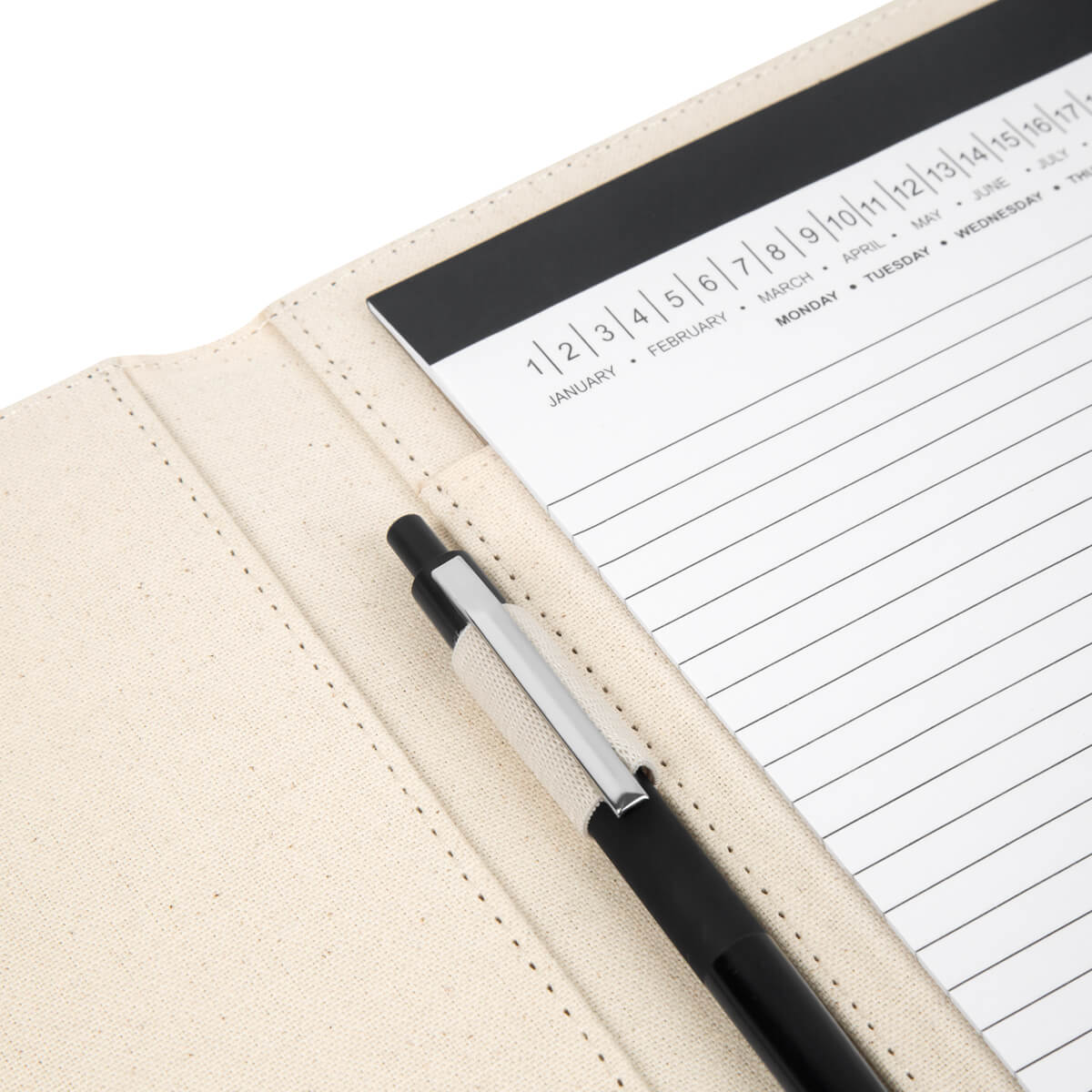 CARPETA JOYCE - Carpeta con compartimentos para hojas y tarjetas. Incluye un block de raya tamaño A4 con 20 hojas y un elástico para sujetar un bolígrafo. No incluye bolígrafo.