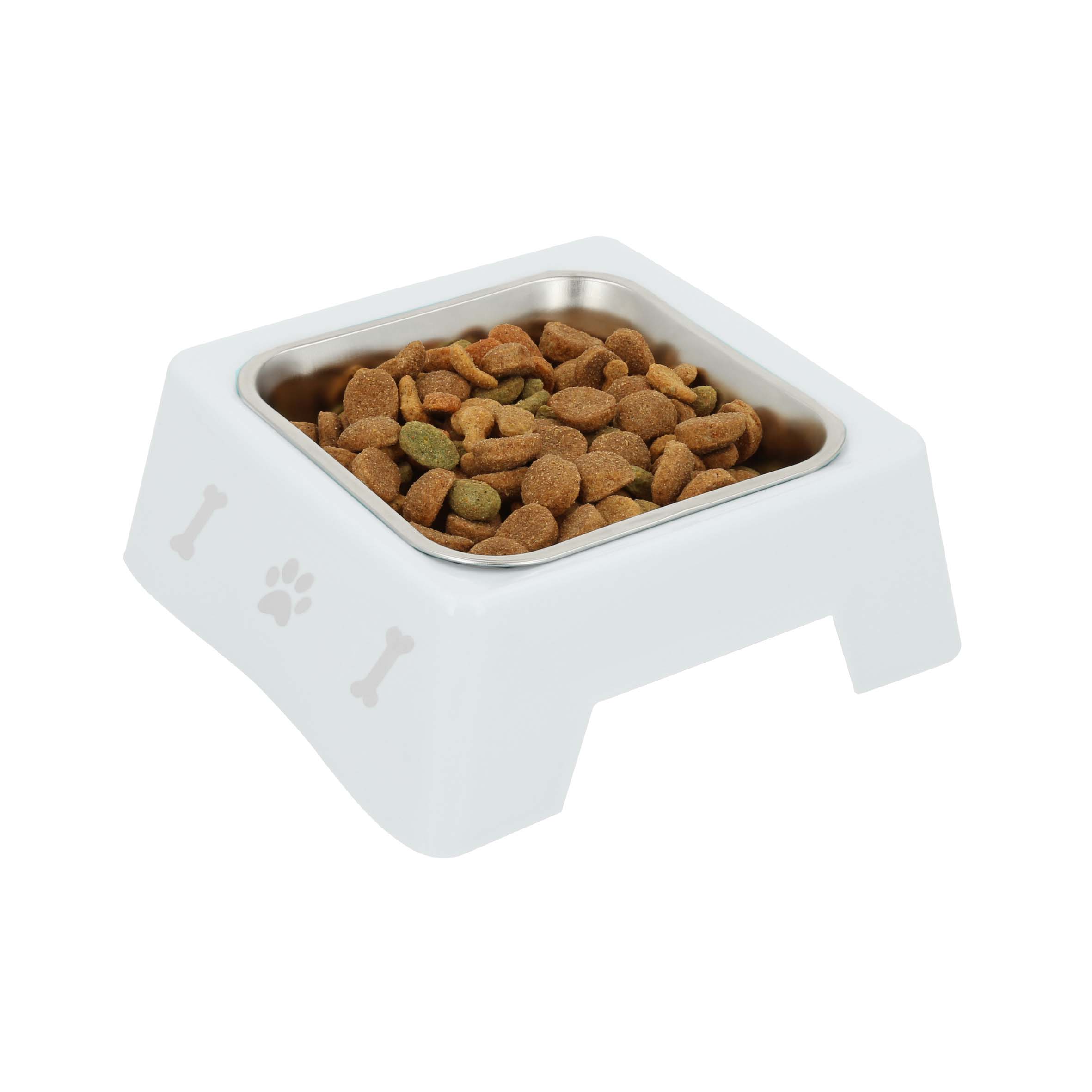GUAU Plato de plástico cuadrado con elementos de hueso y huella de perro en los laterales, cuenta con pieza de aluminio removible.