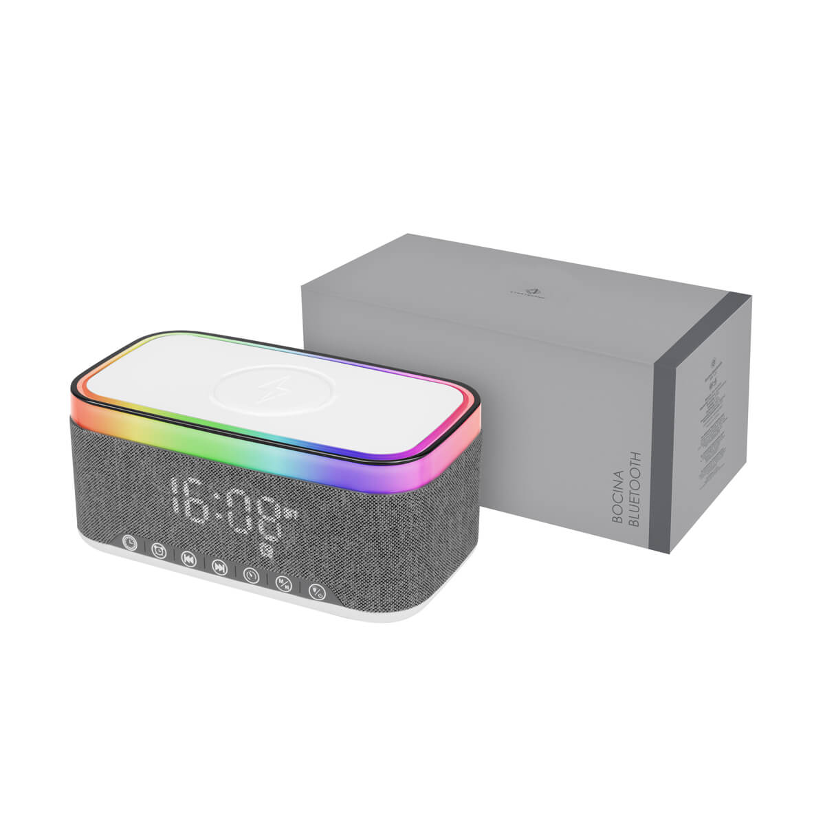RELOJ-BOCINA MULTIFUNCIONAL CORY - Reloj despertador multifuncional. Integra una bocina con tecnología Bluetooth 5.3, cargador inalámbrico de 15 W e iluminación ambiental con 6 modos de luz. El reloj digital ofrece 3 niveles de brillo (bajo, medio y alto). Cuenta con base antideslizante para evitar movimientos no deseados. Incluye cable de carga tipo C y caja individual.