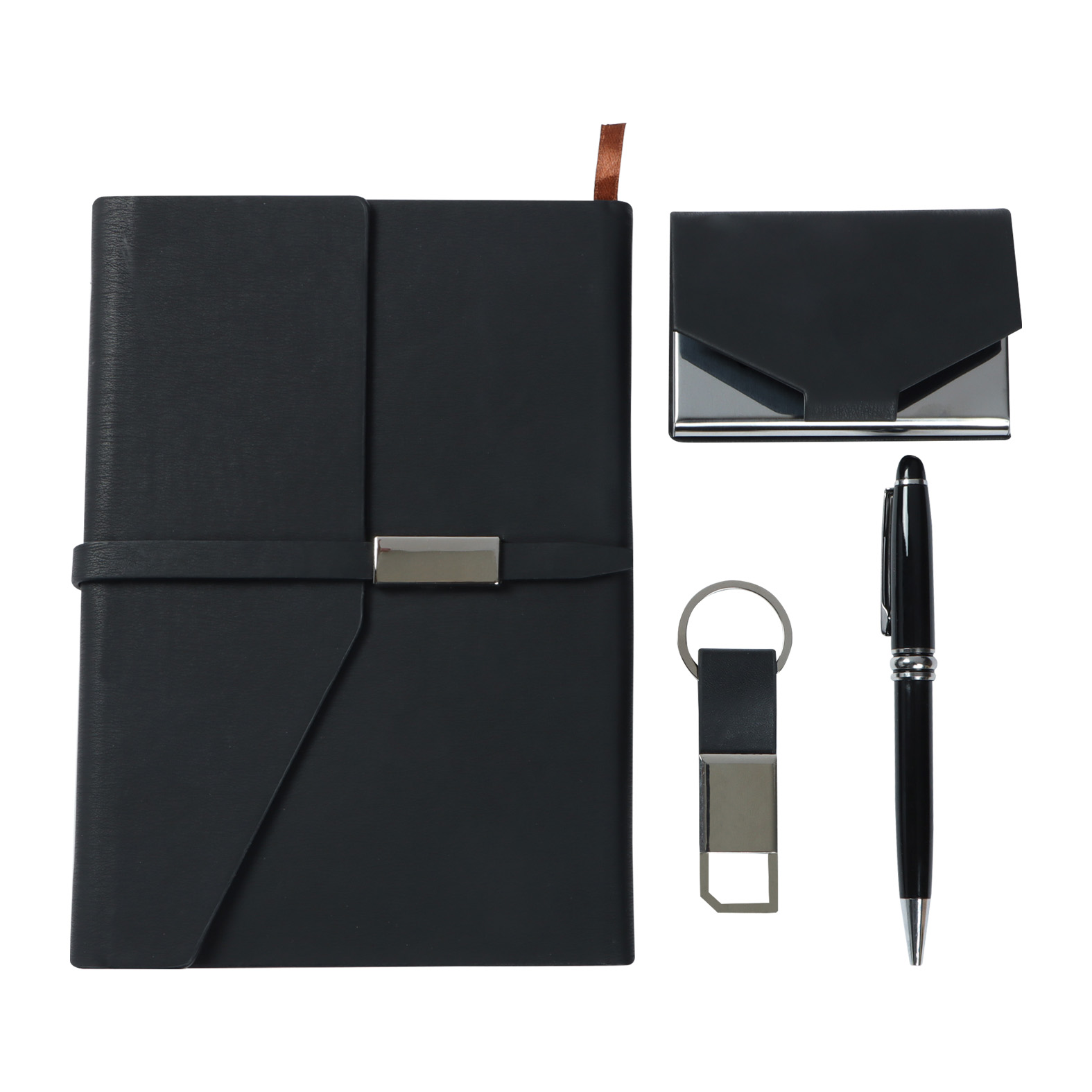 BASS Set ejecutivo que incluye: 1 libreta tipo carpeta con cierre magnético, 1 llavero metálico con correa, 1 pluma de metal con mecanismo retráctil y un tarjetero.