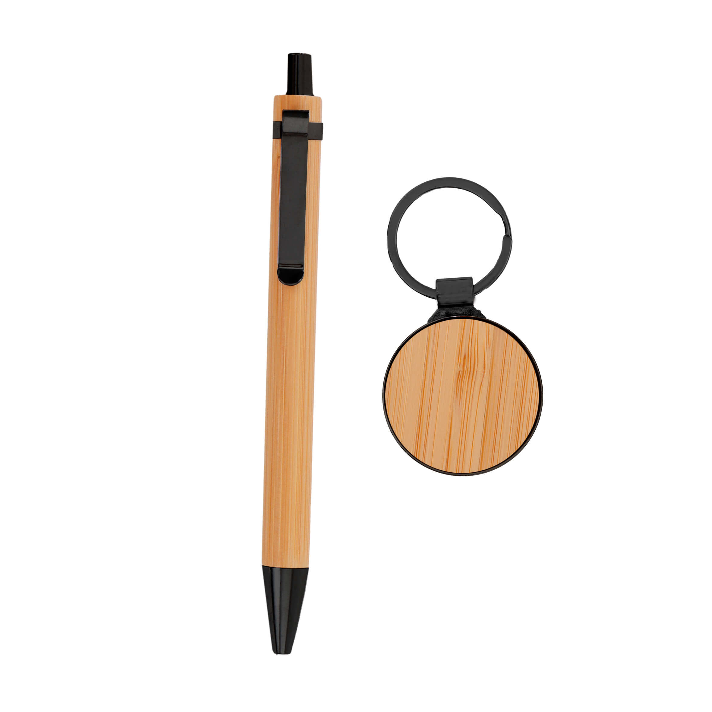 ZANE Set ejecutivo incluye: llavero metálico con detalle en bambú, bolígrafo de bambú, libreta y caja de regalo.
