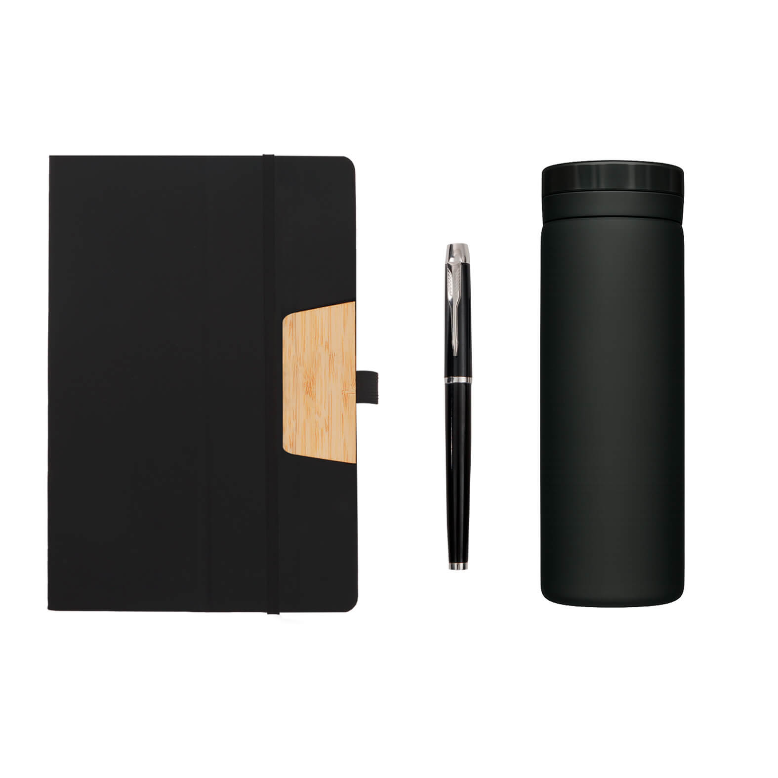 SIDWELL Set ejecutivo incluye: libreta de poliuretano con portada que sirve como soporte de celular, bolígrafo y termo con acabado rubber de 300 ml.