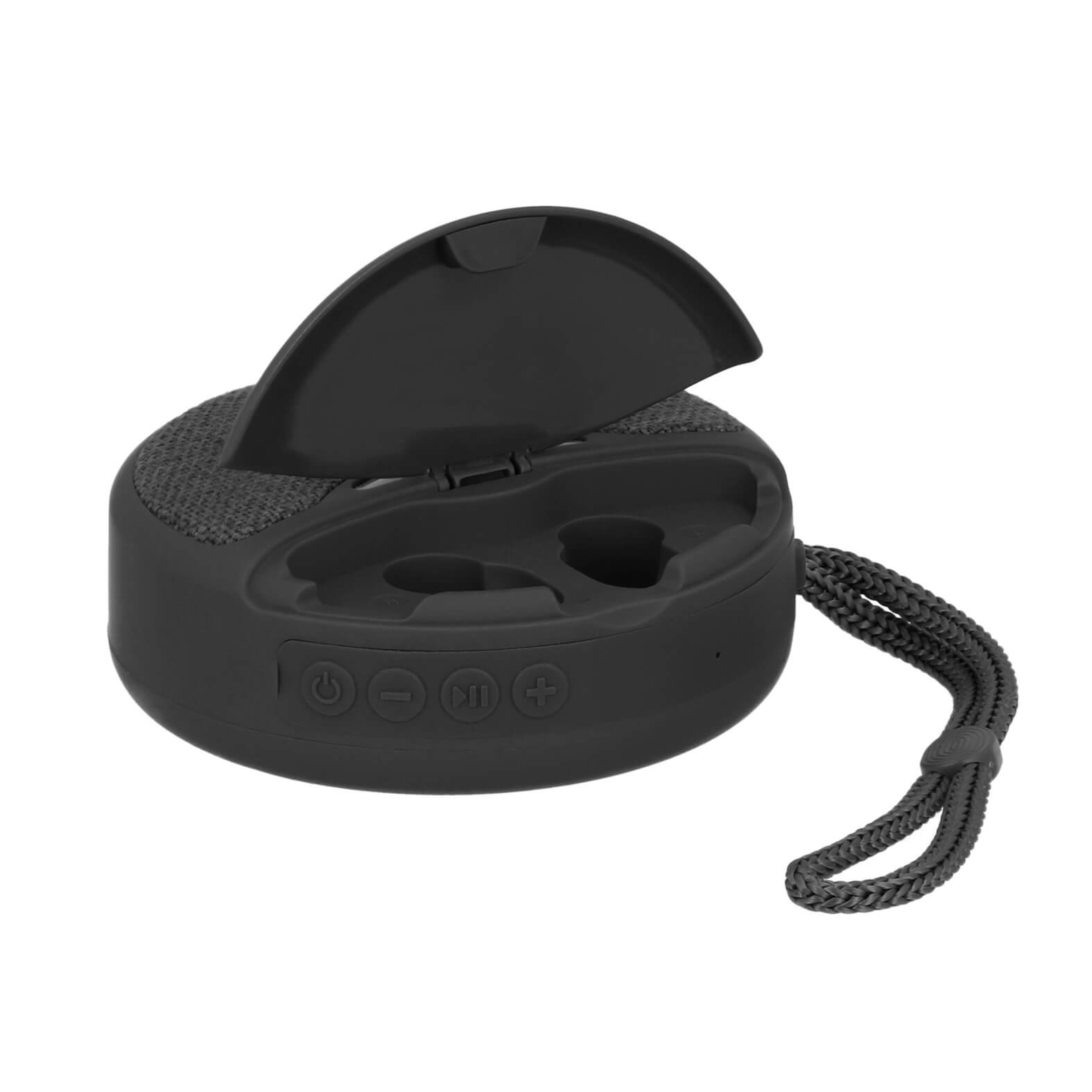 LEVINE Bocina bluetooth portátil con acabado rubber, puerto micro SD, auxiliar, USB, audífonos y cable de carga tipo C.