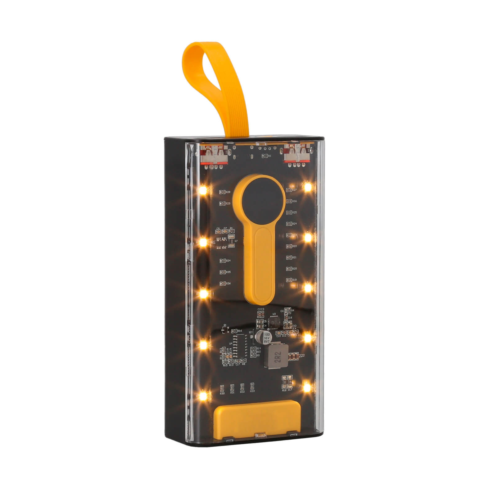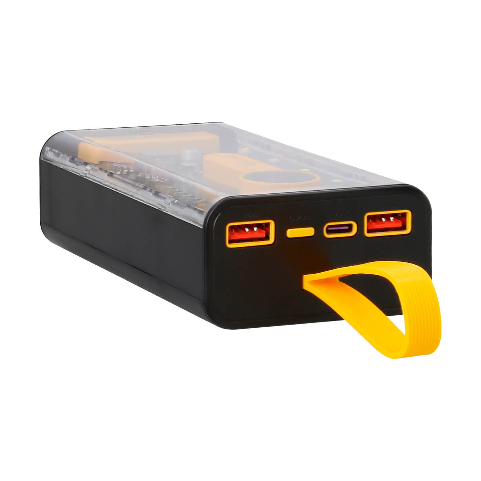 NUR Power Bank transparente de 20,000 mAh con 2 entradas USB, 1 tipo C, botón de encendido o apagado, incluye cables para dispositivos de entrada USB, micro USB, tipo C y lightning, medidor de carga y 4 tipos de luz que sirven como lámpara.