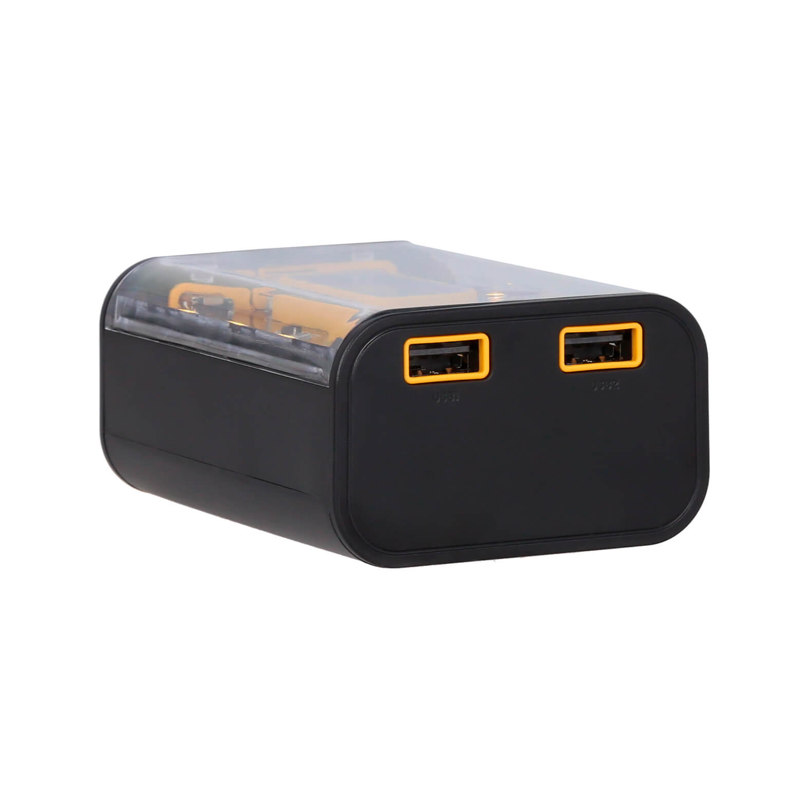 GAMA Power Bank transparente de 6,000 mAh con 2 puertos USB, 1 Micro, 1 tipo C y botón de encendido o apagado. Incluye cables de carga para dispositivos con entrada USB, lightning, tipo C y 4 tipos de luz led que sirven como lámpara.
