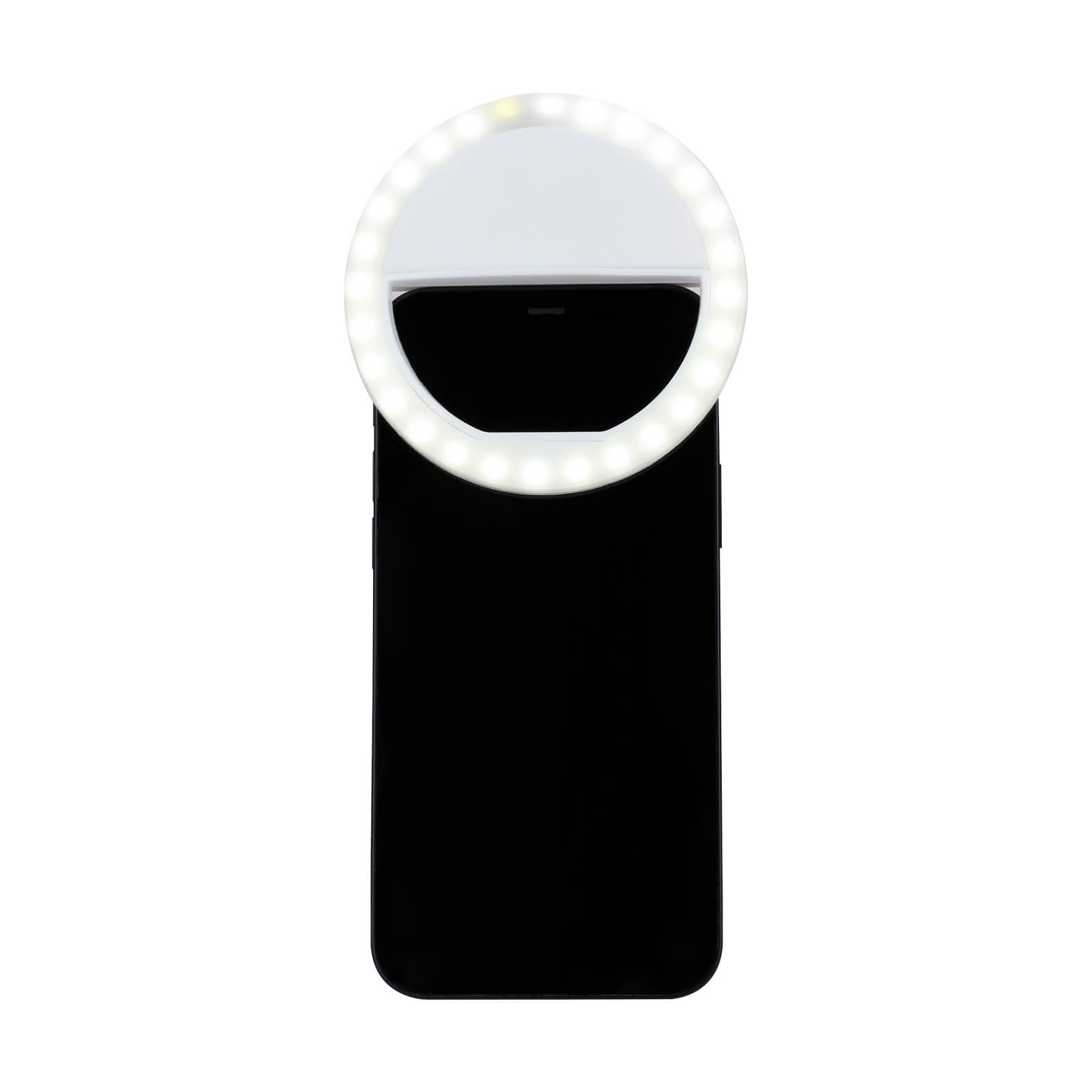 GLIM Mini aro de luz LED con clip ajustable para celulares o equipos de cómputo, cuenta con 3 niveles de intensidad. Incluye cable de carga.