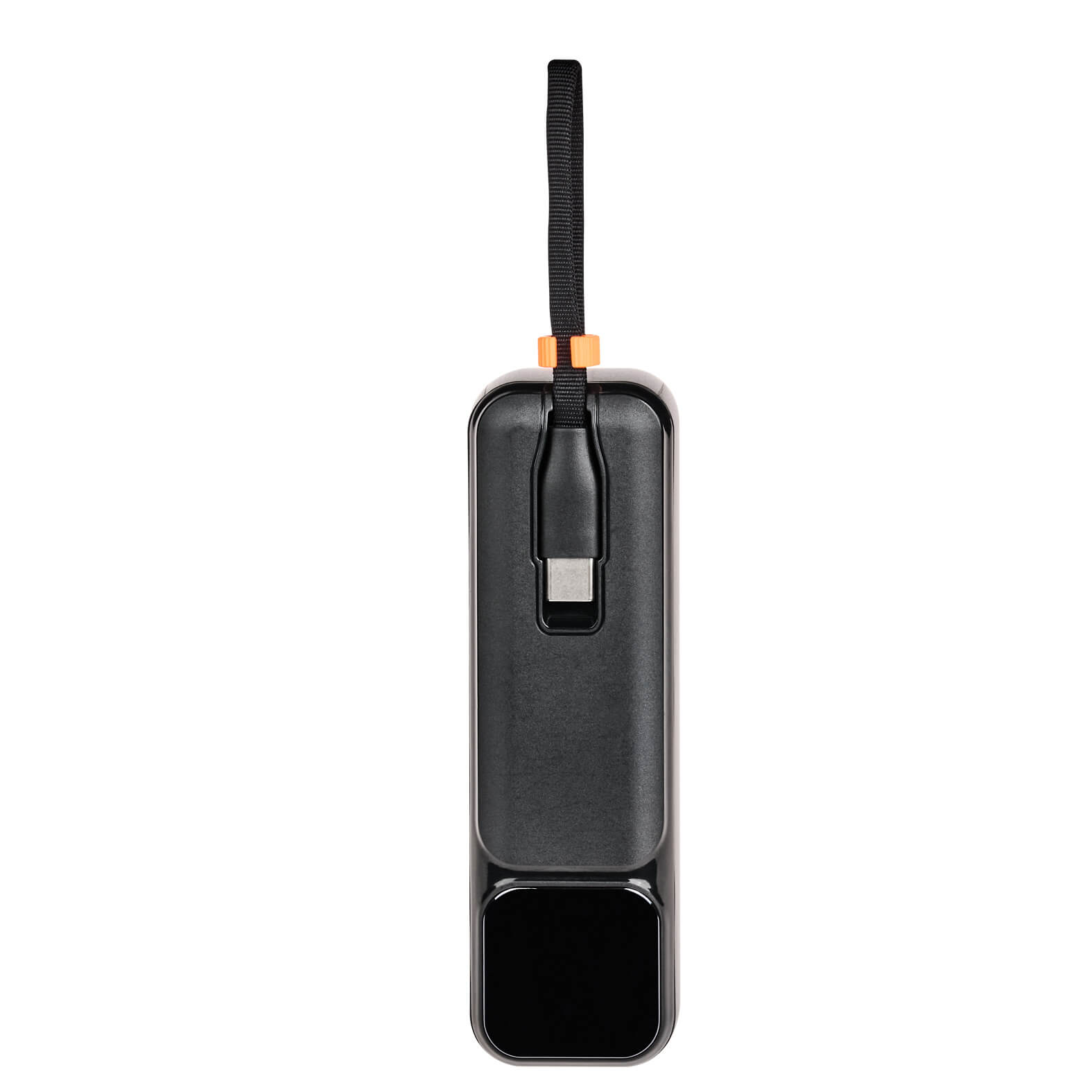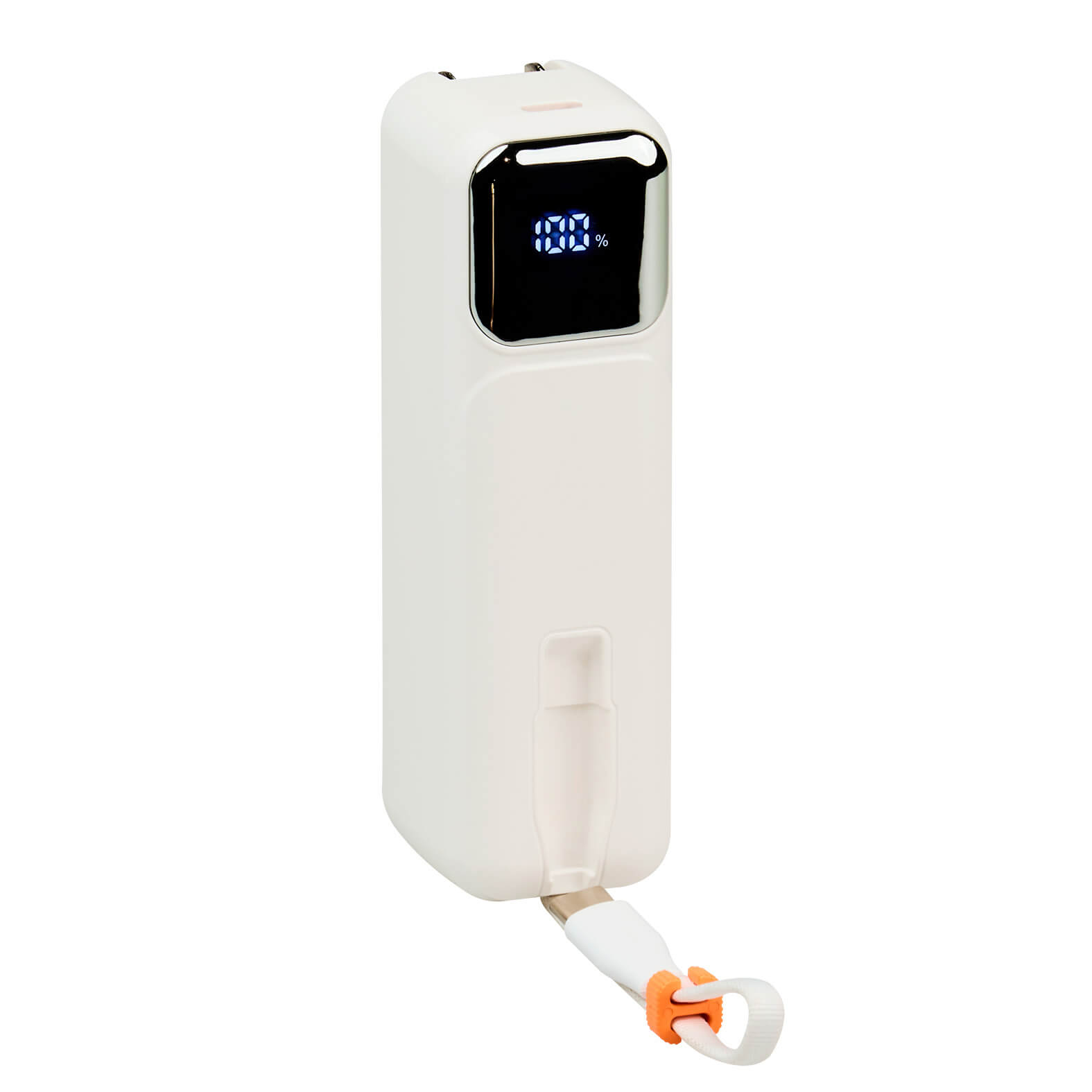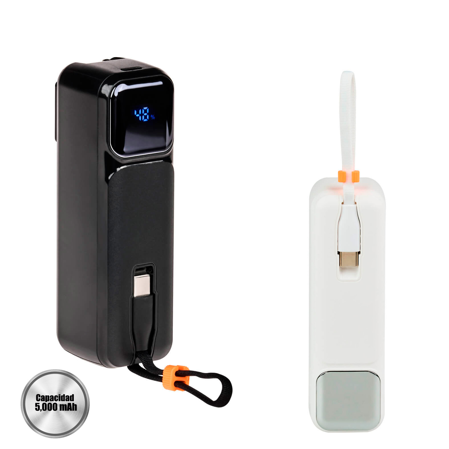 PROMS Power Bank de 5,000 mAh con carga rápida, enchufe integrado, cable de carga tipo C e indicador de carga.