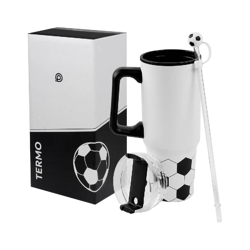 TERMO SOCCER - Doble pared. Pared interna de pastico y externa acero inoxidable. Tapa de plástico y cierre con sistema de rosca y sobretapa giratoria de tres posiciones con ranura para popote. Incluye popote con tapón de silicón en forma de balón. Asa de plástico para llevarlo fácilmente a todos lados. Capacidad de 28 Oz. Base de 7.2 cm de diámetro. Incluye caja individual.