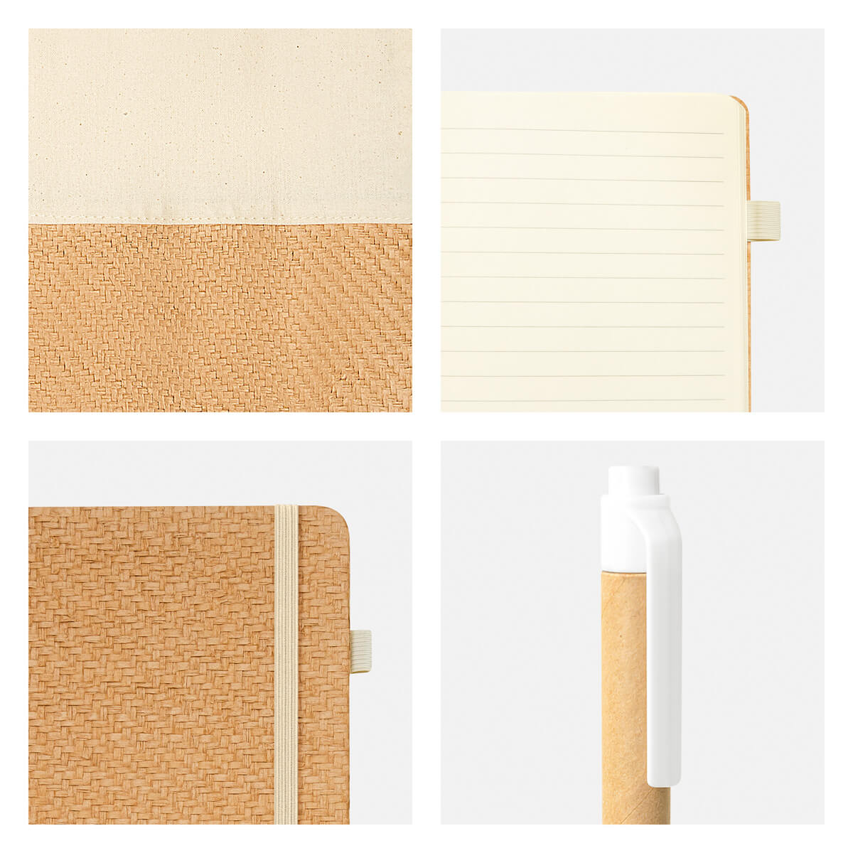 SET ECOLÓGICO BIOSET - Set ecológico fabricado con materiales amigables con el medio ambiente. Incluye libreta con cubierta rígida, 80 hojas a rayas, elástico para cerrar y elástico porta bolígrafo. Bolsa de algodón estilo tote. Bolígrafo de cartón con sistema push. Presentado en caja de cartón tipo regalo.