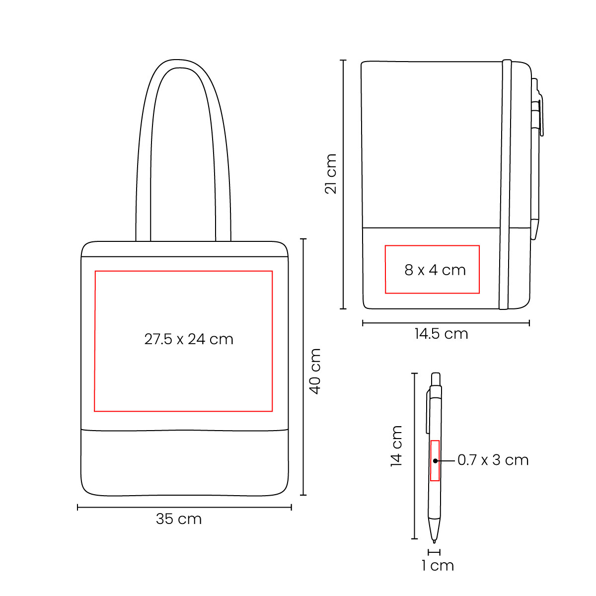 MATERIAL: Cartón / Algodón / Papel MEDIDAS: 28.8 x 22.2 x 5 cm Caja / 35 x 40 cm Bolsa / 14.5 x 21 cm Libreta / 1 x 14 cm Bolígrafo IMPRESION: Serigrafía / Tampografía MED. EMPAQUE: 45.5 x 29.5 x 29.5 cm PESO EMPAQUE: 0.7 Kg PIEZAS EMPAQUE: 10