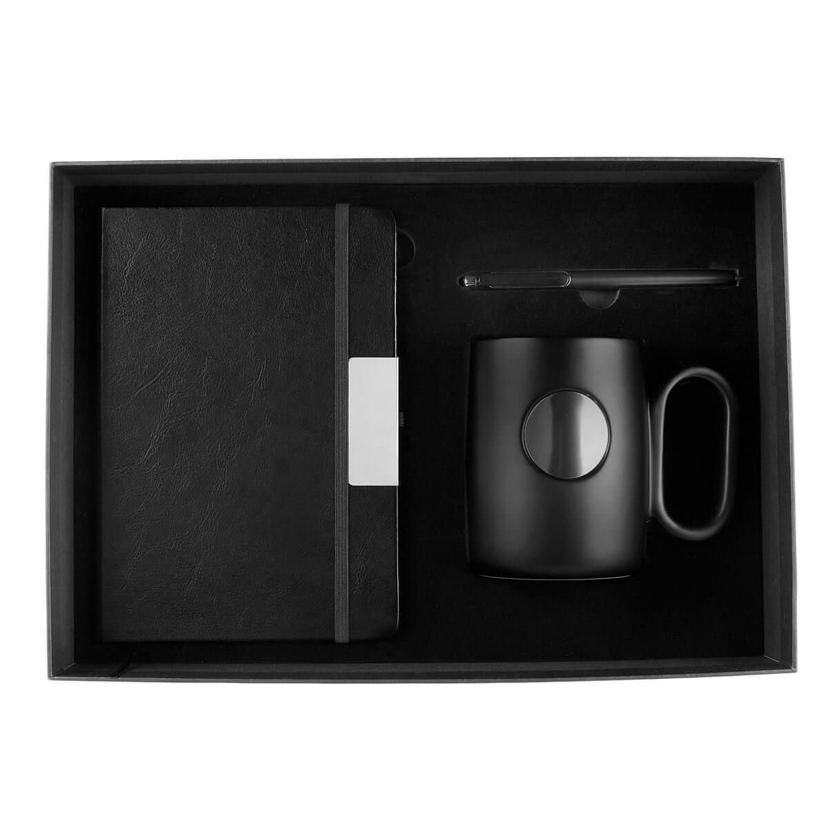 SET NOTULA - Set de regalo ejecutivo de 3 piezas. Contiene libreta de pasta dura con 80 hojas recicladas a raya y placa metálica. Incluye listón separador y elástico porta bolígrafo. Bolígrafo de plástico con mecanismo pulsador y taza de carámica con placa metálica circular. Capacidad de 473 ml. Incluye caja de regalo rígida.