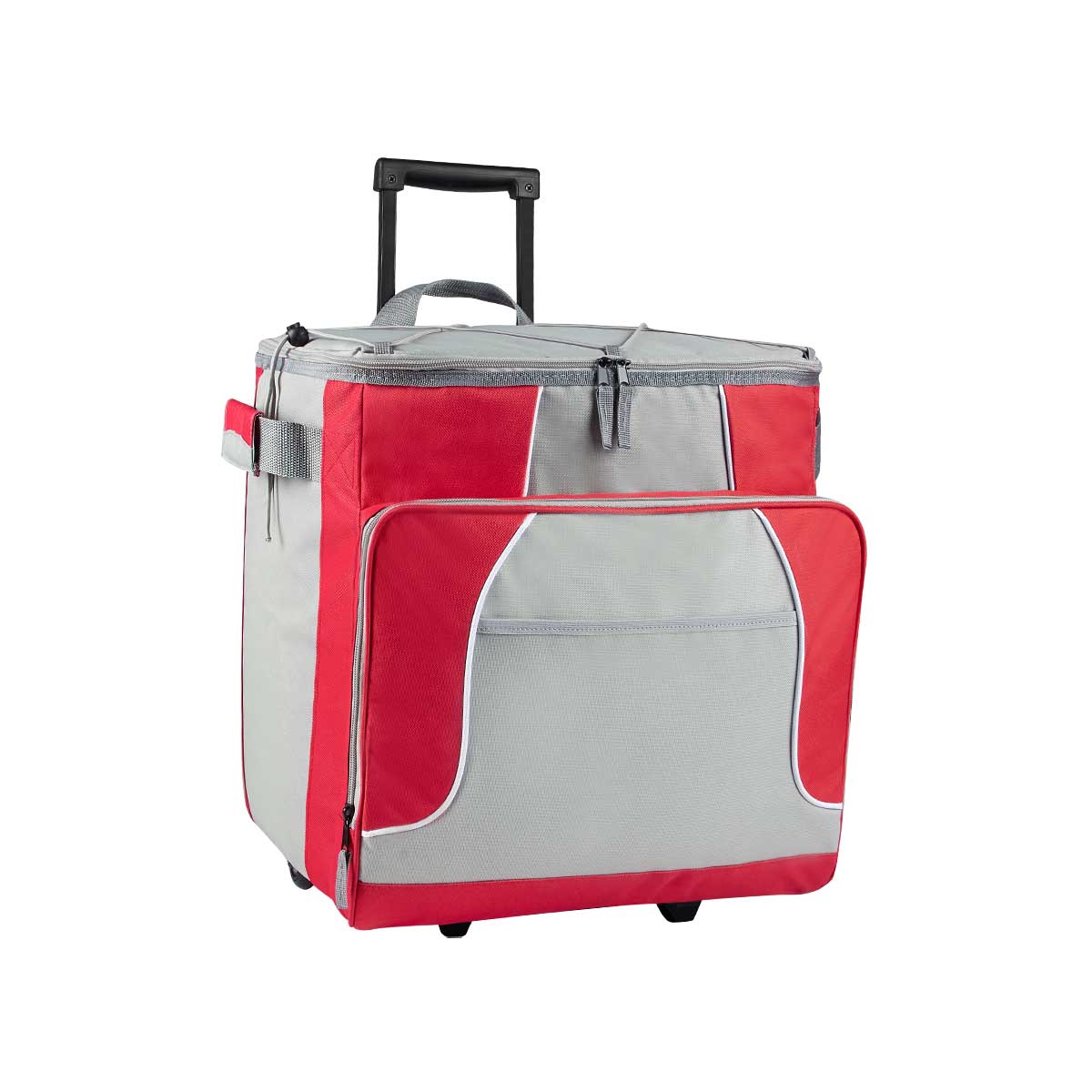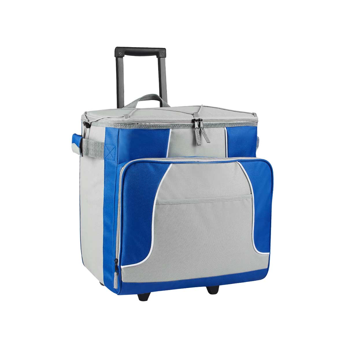 HIELERA TROLLEY OSLO - Interior plastificado impermeable. Bolsa frontal y 2 compartimentos con cierre. Agarraderas laterales. Mecanismo trolley. Elástico ajustable en la parte superior de la tapa. Capacidad para 40 latas. Este producto por ser últimas piezas puede presentar alguna variación, no se aceptan devoluciones.