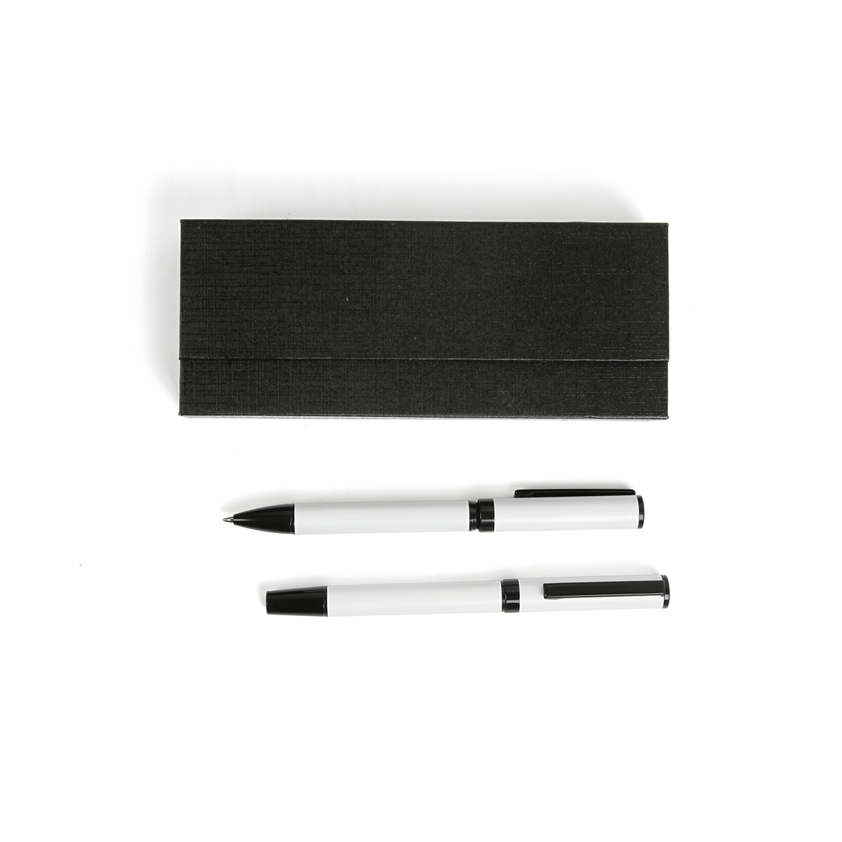 Set Signore. - Set ejecutivo de dos bolígrafos metálicos color blanco con detalle en negro, incluye caja de regalo. Un bolígrafo con mecanismo retráctil y otro con mecanismo twist.