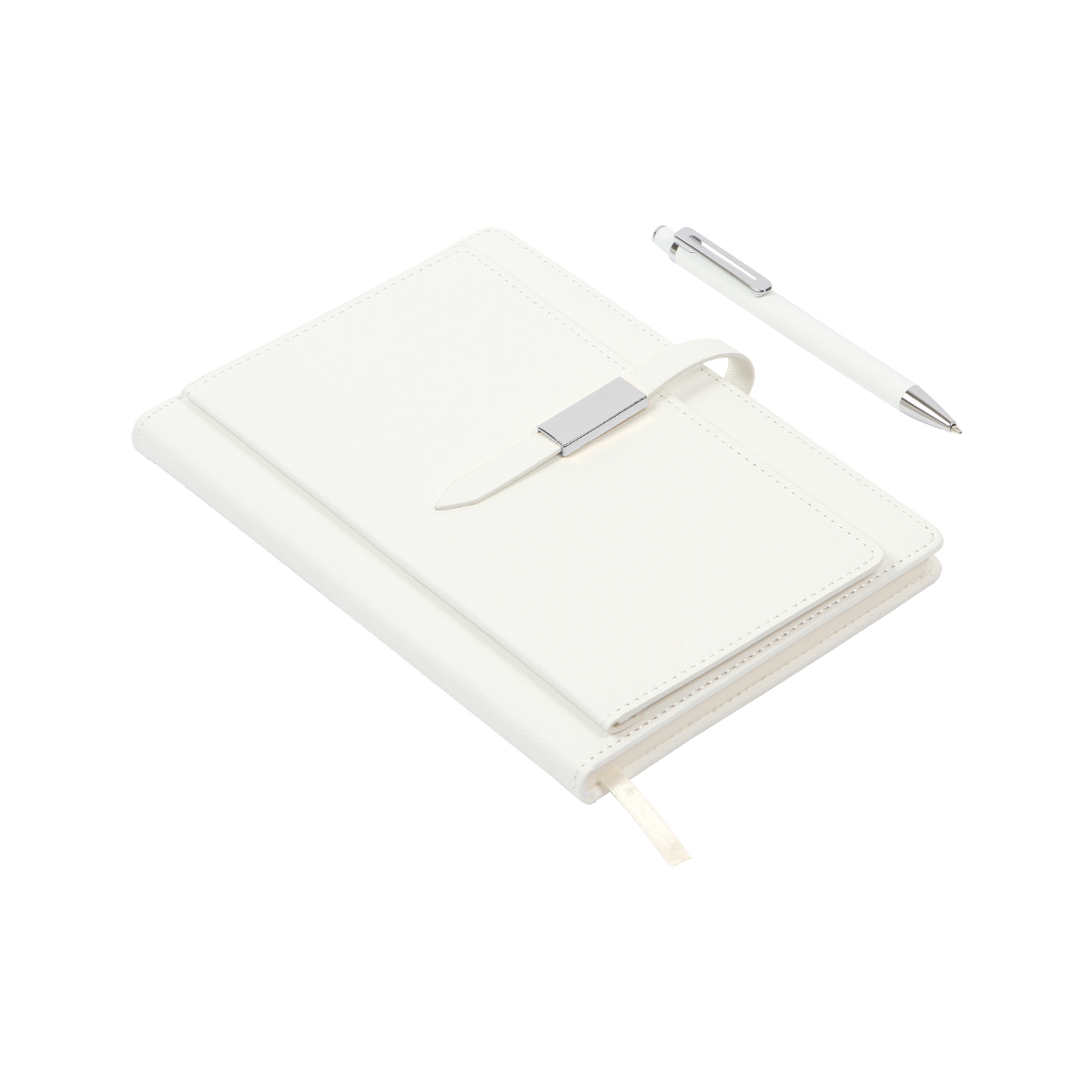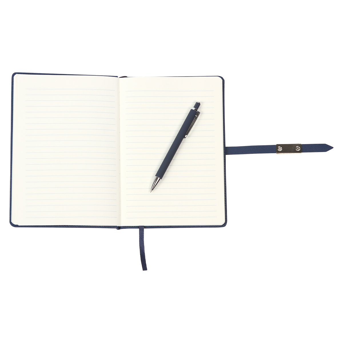 Set Clyth. - Libreta con cubierta de pasta dura cubierta en curpiel, 80 hojas rayadas de 80?g., listón separador de 6?mm y detalles metálicos en color plateado. Incluye un bolígrafo con cuerpo fabricado en aluminio de acción de botón, tinta azul. Elegancia y funcionalidad para el día a día.