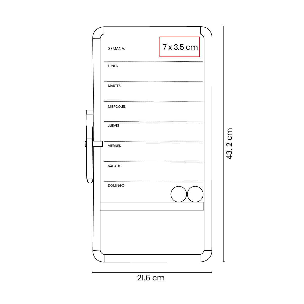 PINTARRÓN DAKO - Pintarrón con planeador semanal ideal para organizar tus tareas más importantes. Incluye marcador en color negro con borrador. Superficie magnética para sujetar notas, mientras que la parte inferior cuenta con una sección de corcho para colocar papeles o documentos. Gracias a su gancho en la parte superior, este pintarrón es fácil de colgar. Incluye dos imanes adhesivos para fijar en la pared.