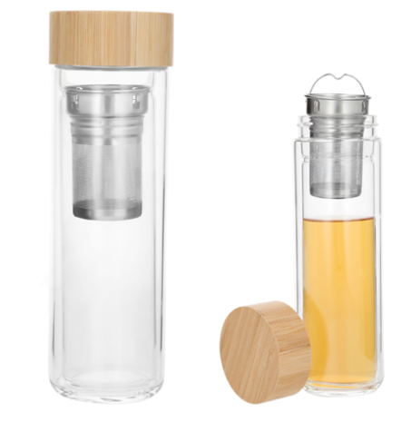 INFUSION Termo con doble pared de vidrio e infusor, colador de metal y tapa de bambú enroscable.