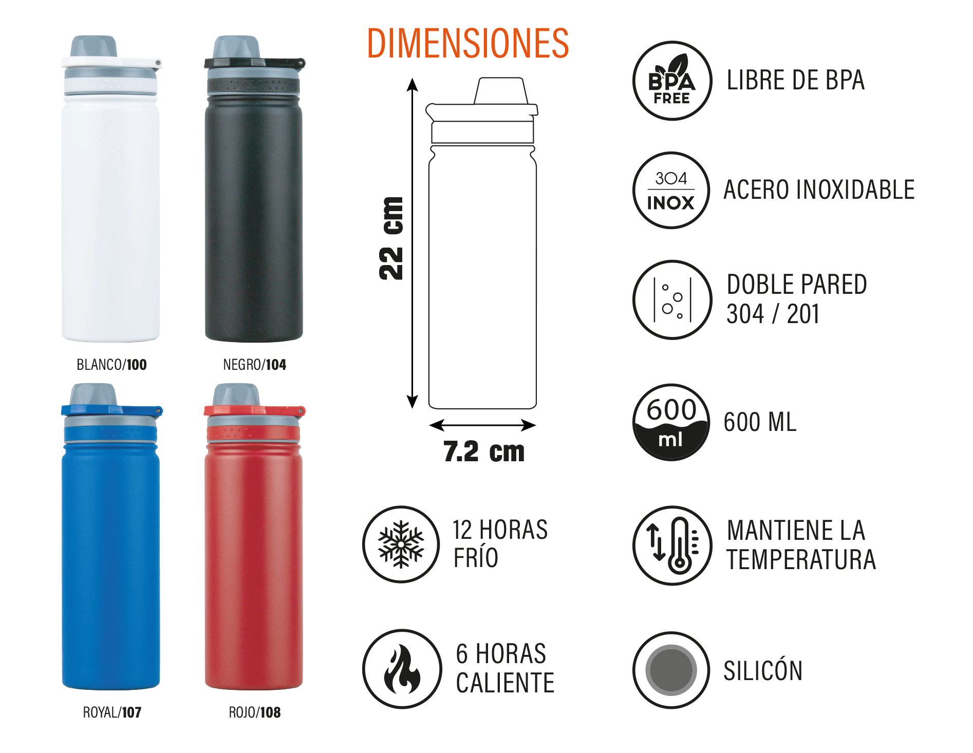TERMO CALIFORNIA BLANCO 600 ML ACERO DOBLE DEPORTIVO TIPO BOTELLA CON AGARRADERA Y ANTIDERRAPANTE