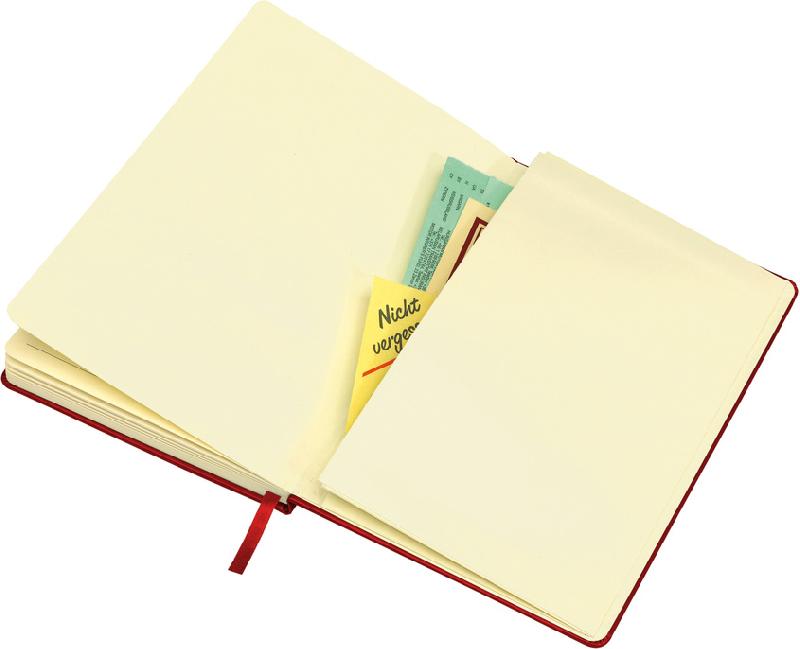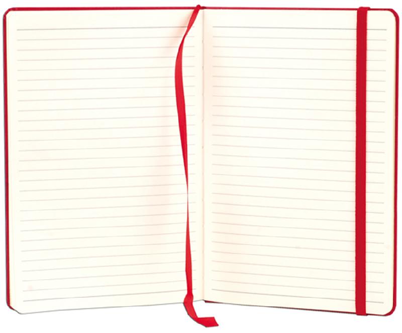 LIBRETA MEDIANA Separador de hojas en tela. Cierre con banda elástica. Sobre portapapeles en el interior de la pasta posterior.