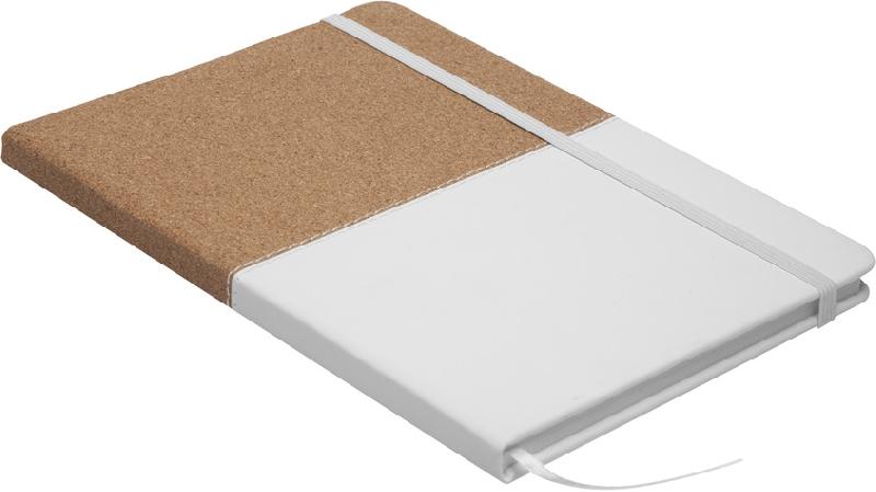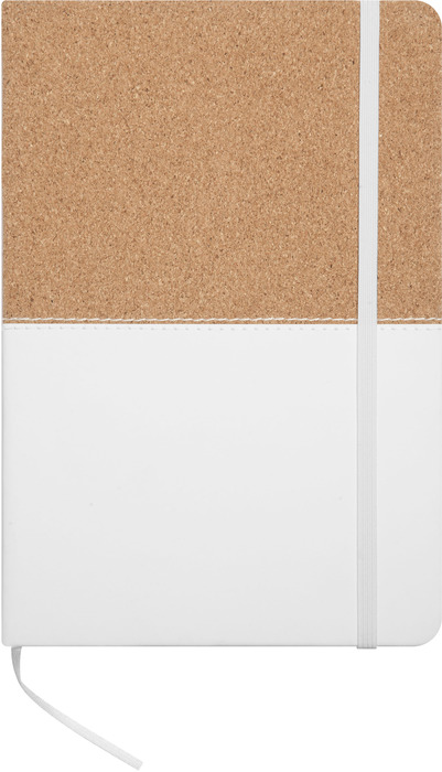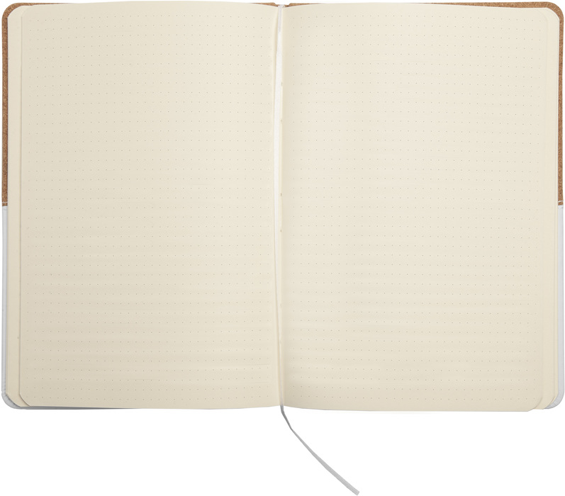LIBRETA "GRECIA" Libreta de símil corcho y PU con detalle de costura. 80 hojas con renglones punteados, señalador de tela y elástico de color que cierra o sostiene la hoja.