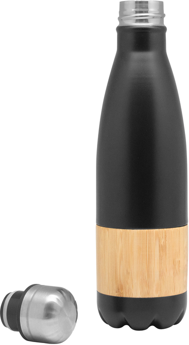 BOTELLA TÉRMICA "TRACY" Botella doble pared, sellada al vacío. Interior en acero 304 y exterior en acero 201, con detalles de Bambú. Tapa de acero. Mantiene hasta 12 hs la temperatura de las bebidas calientes y 24 hs de las bebidas frías. Presentación en caja de regalo Kraft.