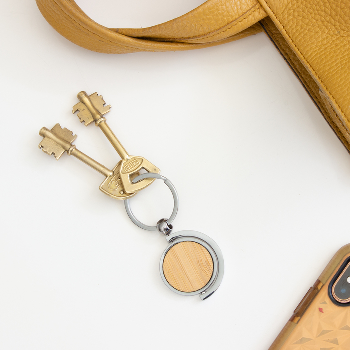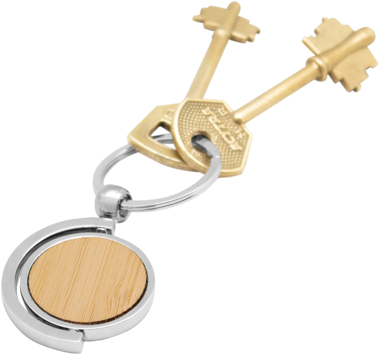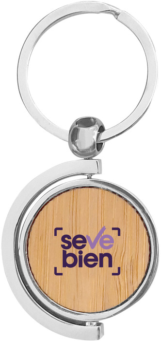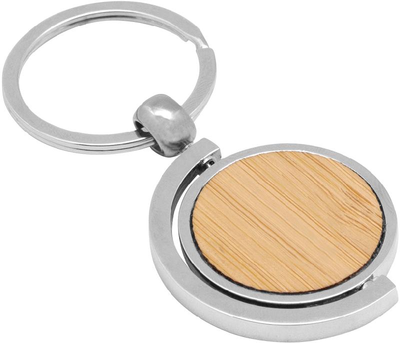 LLAVERO DE BAMBÚ "SPIN" Llavero circular de bambú con detalles metálicos. Estructura giratoria 360°. Presentación en caja de regalo.