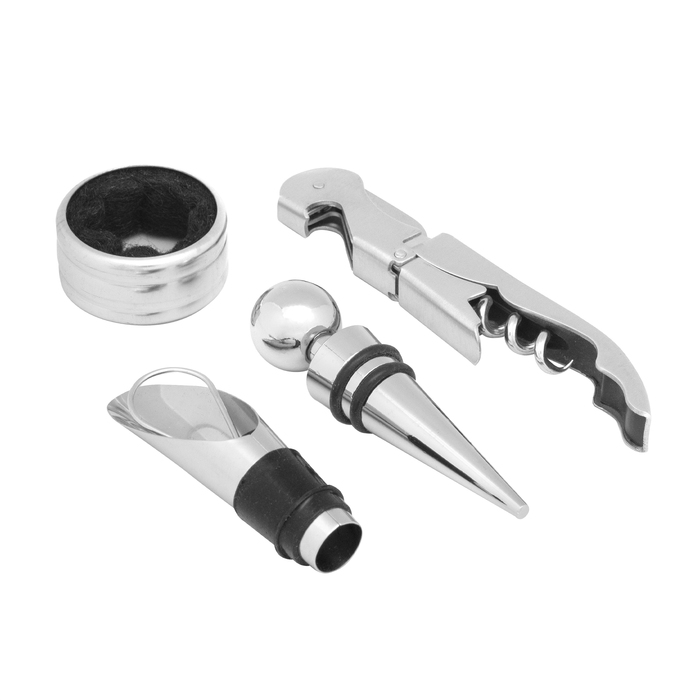 SET DE VINOS CON JUEGO DE AJEDREZ "CHESSY" Set de vino de 4 piezas (sacacorchos, anillo antigoteo, tapón y vertedor) con juego de ajedrez. Caja contenedora en bambú con piezas de ajedrez en madera. Abridor de acero inoxidable 420. Anillo de acero inoxidable 210. Tapón con aleación de zinc y aluminio. Vertedor de acero inoxidable 201 + silicona. Presentación en caja de regalo kraft.