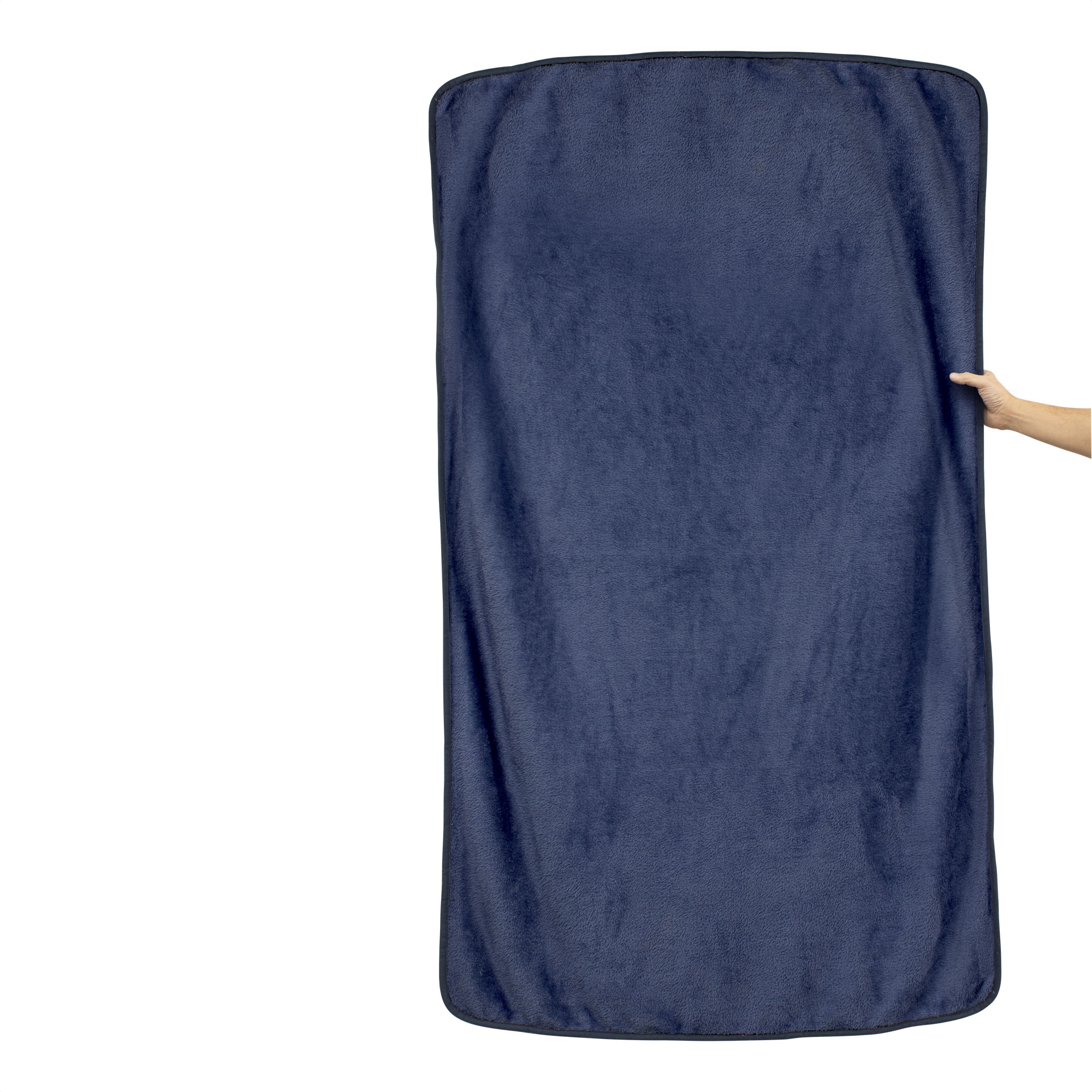 MATERIAL: Forro polar de 220 g/m2, poliéster y aluminio MEDIDAS: 150 x 100 cm. Funda 35 x 25 cm IMPRESION: Serigrafía