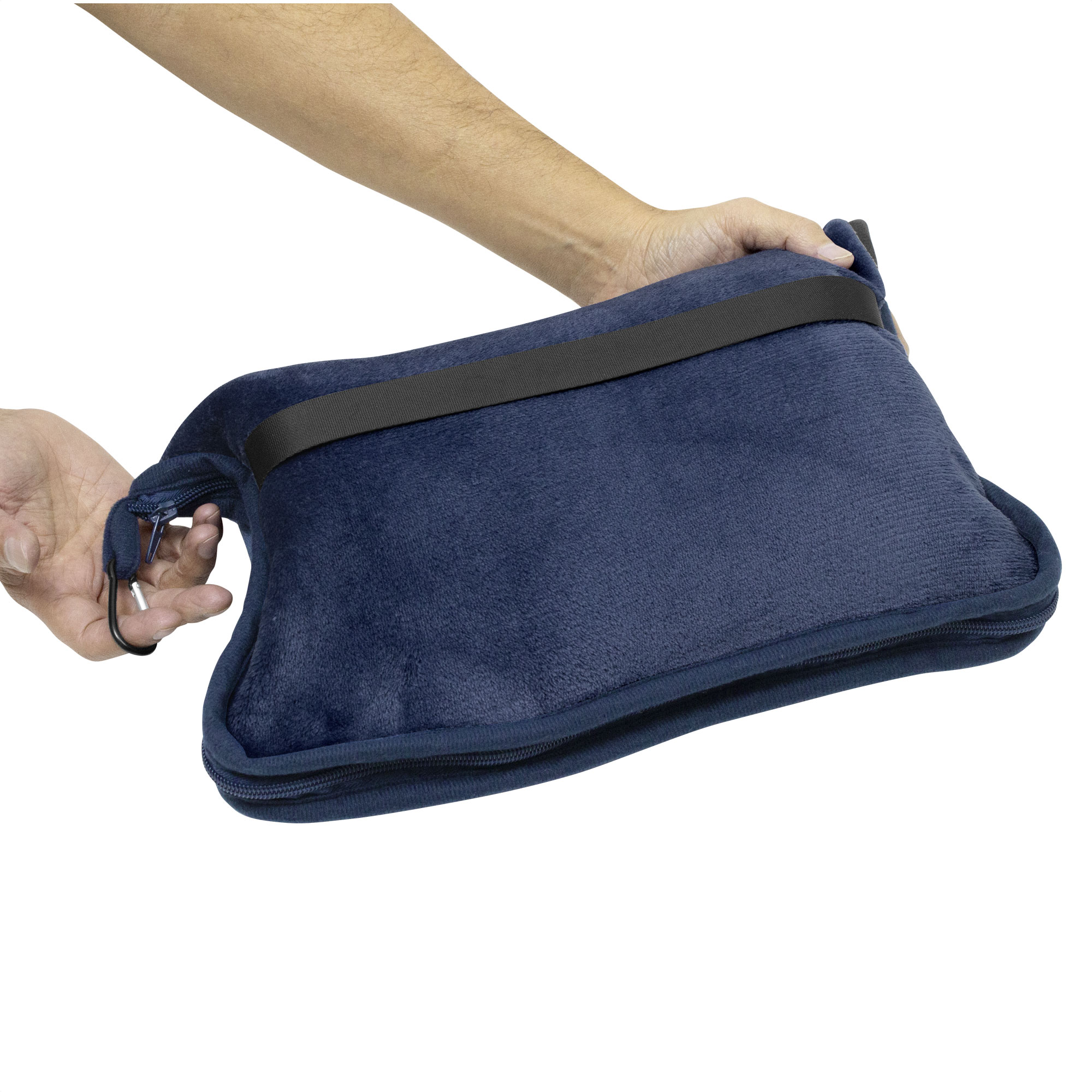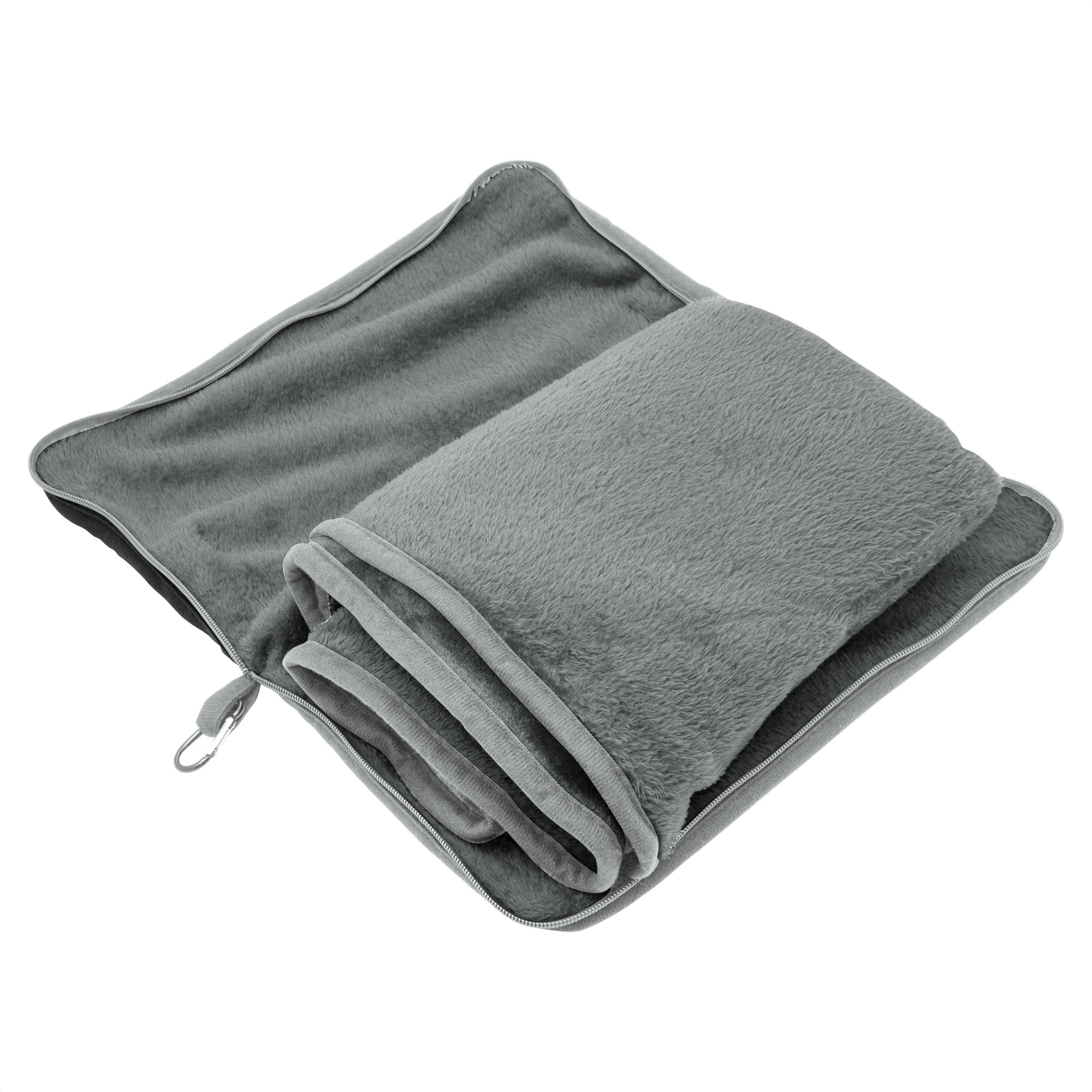 Manta y almohada de viaje "TEDDY" Manta y almohada de viaje compacta 2 en 1. Manta de polar de alta calidad con textura aterciopelada al tacto. Doble felpa, de pelo corto y largo. Funda con cierre del mismo material, con mosquetón para colgar en mochila y tira para sujetar la mochila en la manija extensible de un equipaje de mano. Cuando la manta está plegada y dentro de la funda se puede utilizar como almohada