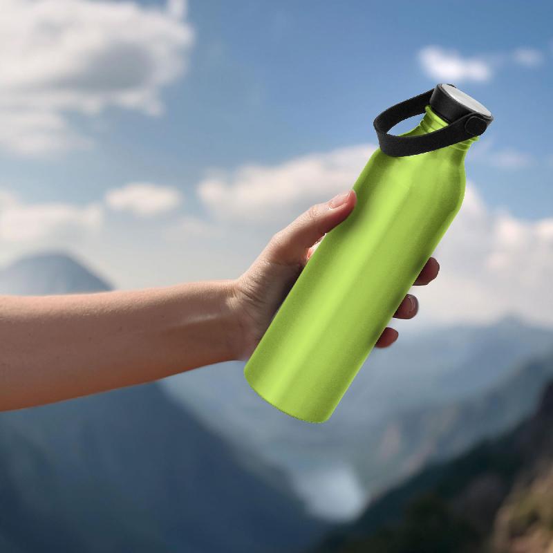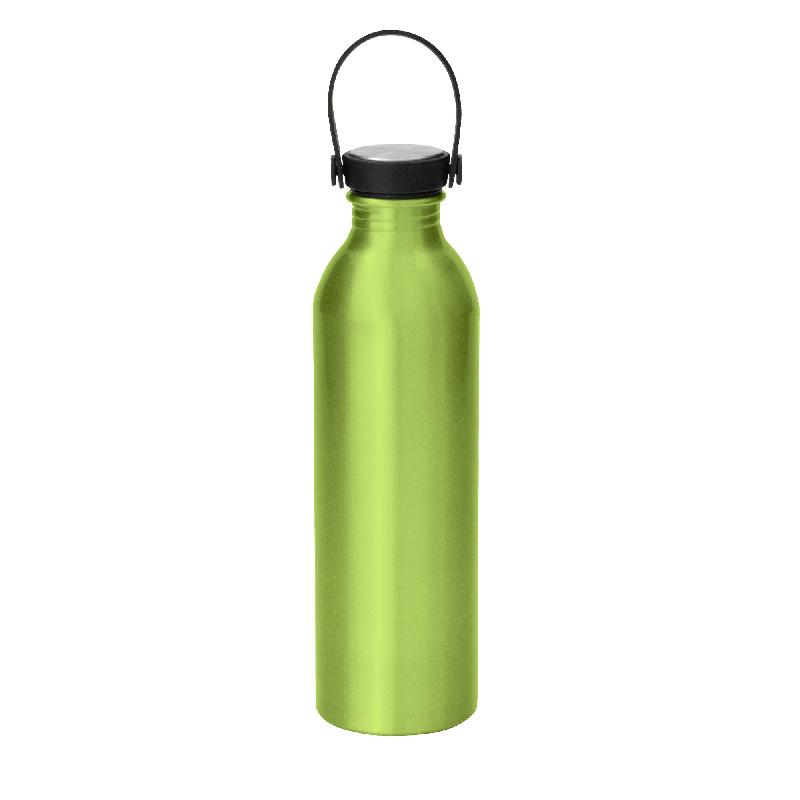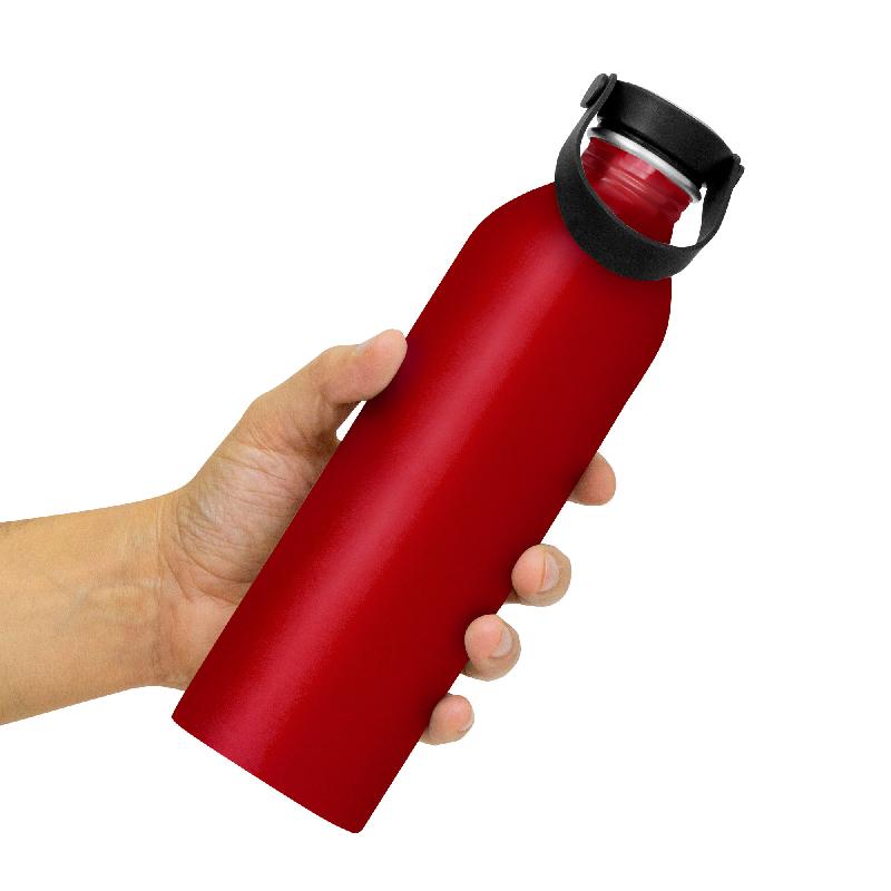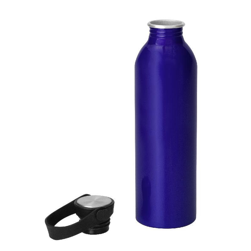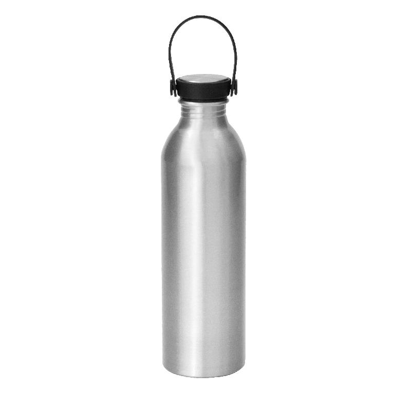 Botella "SILLY" Capacidad 640 ml. Aluminio. Botella de aluminio con acabado brillante. Tapa a rosca de acero inoxidable 201 y PP, con tira de silicona color negro. Presentacion en caja de regalo kraft.