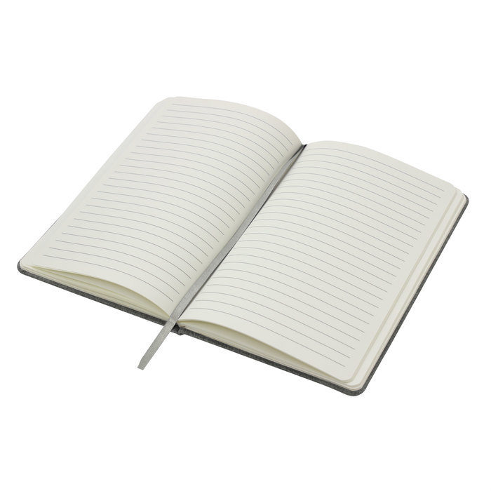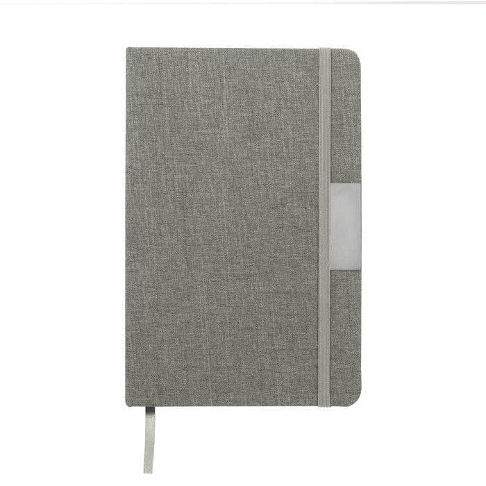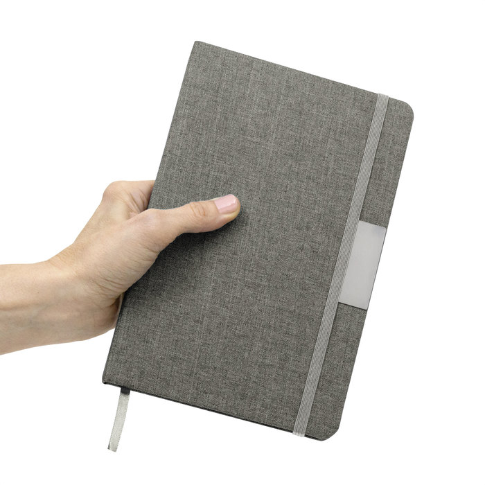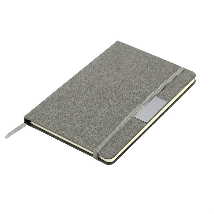 Libreta "GRETA" Sostenibilidad elegante. Libreta con placa metálica. Tapa de cartón de 300g recubierta en RPET 310. Placa metálica de 5 x 2 cm. Interior de 80 hojas rayadas en papel obra de 70g. Encuadernación cosida. Cierre con banda elástica del mismo color de la tapa.