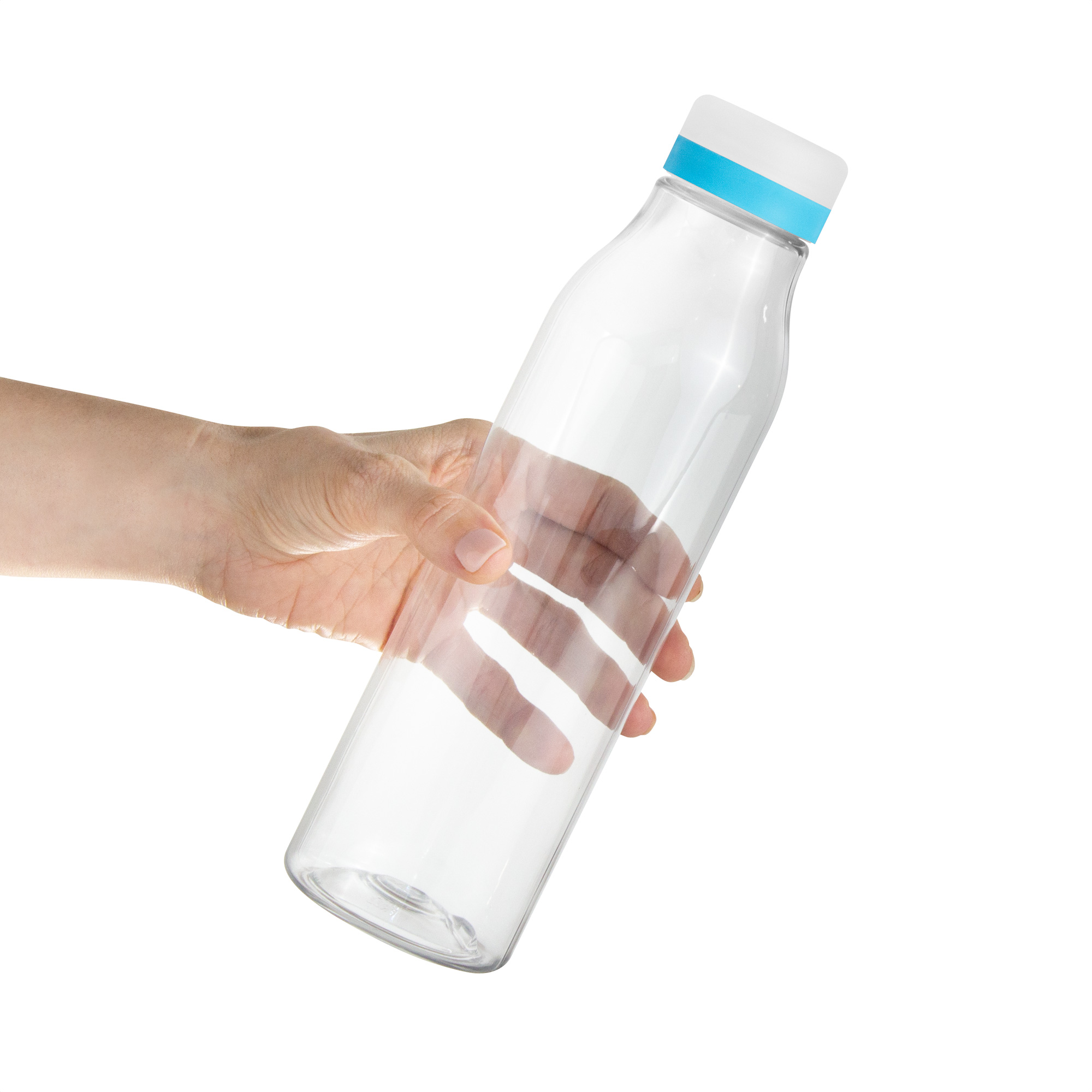 Botella "ANDINA FROST" Botella de plástico transparente con tapa a rosca esmerilada con anillo de silicona de diferentes colores