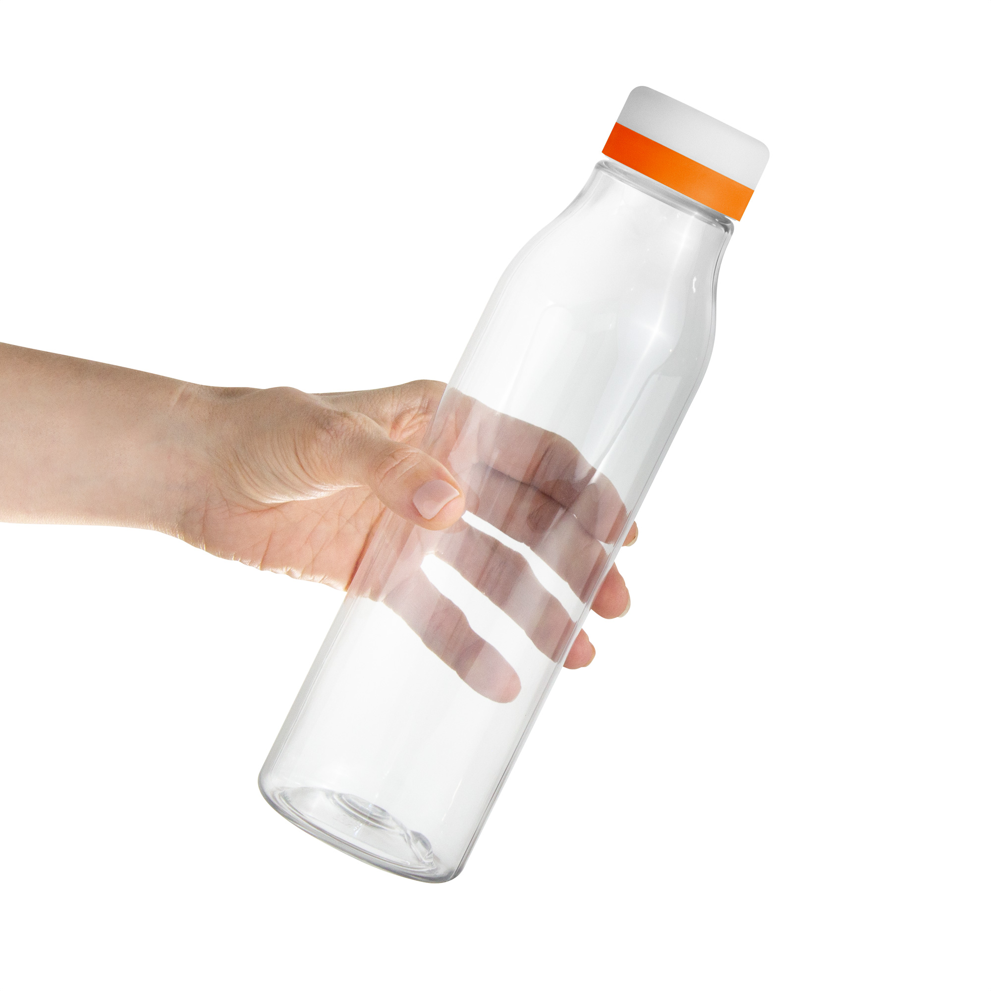 Botella "ANDINA WHITE" Botella de plástico transparente con tapa a rosca color blanco mate con anillo de silicona de diferentes colores
