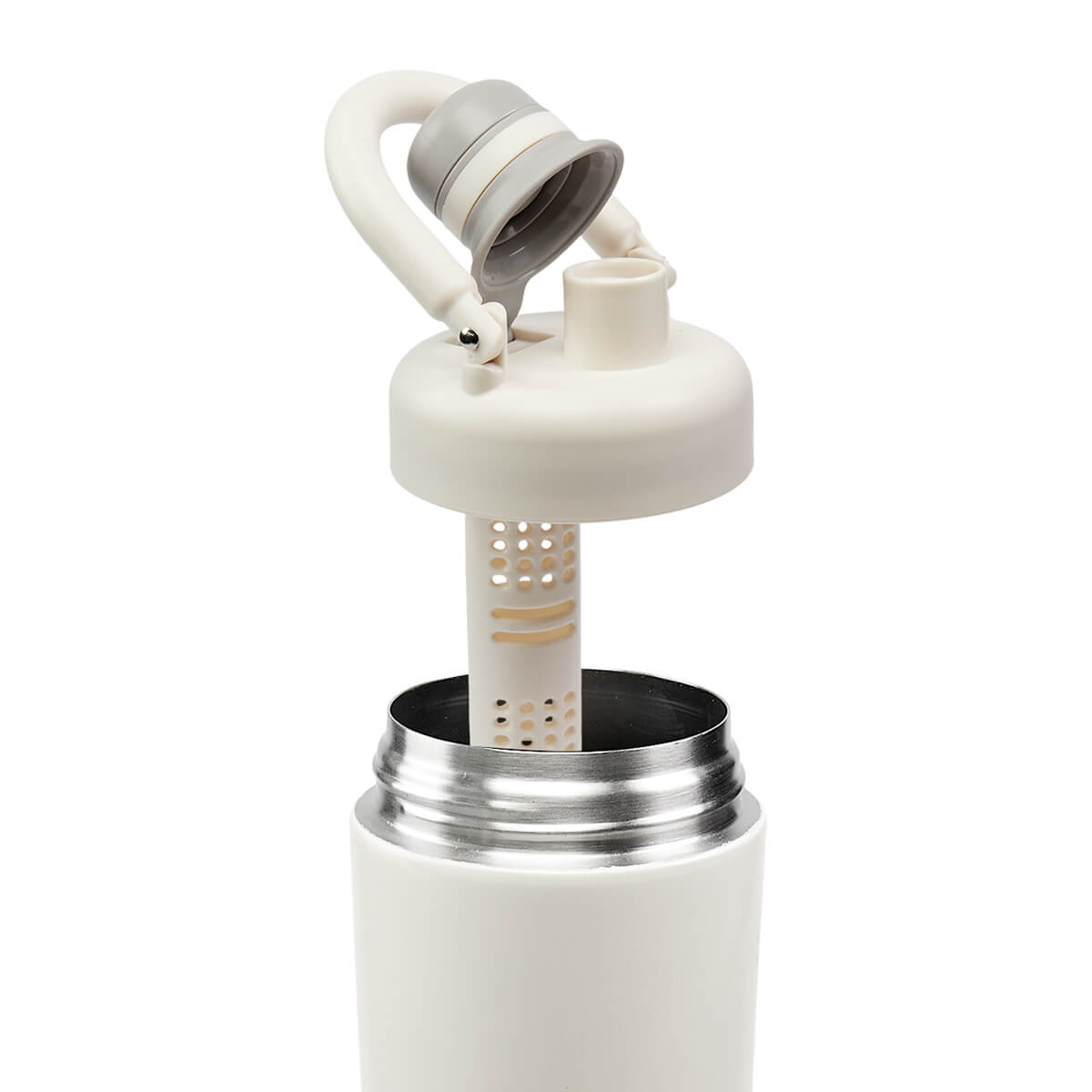 TERMO DAZZ - Termo doble pared. Cerrado al vacío. Pared interna y externa de acero inoxidable. Terminado en texturizado rugoso, que facilita su agarre. Incluye tapa de plástico con sistema de rosca, sobre tapa con boquilla y filtro interno para infusiones o tisanas. Su diseño elegante y minimalista se complementa con un asa ergonómica que facilita el transporte, ideal para transportarlo a donde quiera que vayas. El termo está pintado a mano, por lo tanto el color y degradado pueden variar en todos los modelos. Mantiene tus bebidas calientes por 6 hrs y frías hasta 12 hrs. Capacidad de 27 Oz. Incluye caja individual.