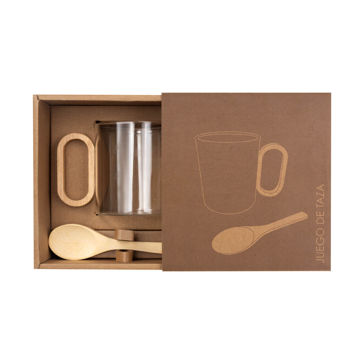MATERIAL: Vidrio Borosilicato / Bambú MEDIDAS: 8 x 9.4 x 11.5 cm Taza / 3.7 x 13 cm cuchara IMPRESION: Serigrafía MED. EMPAQUE: 50.5 x 37.5 x 35.5 cm PESO EMPAQUE: 1.68 Kg PIEZAS EMPAQUE: 24