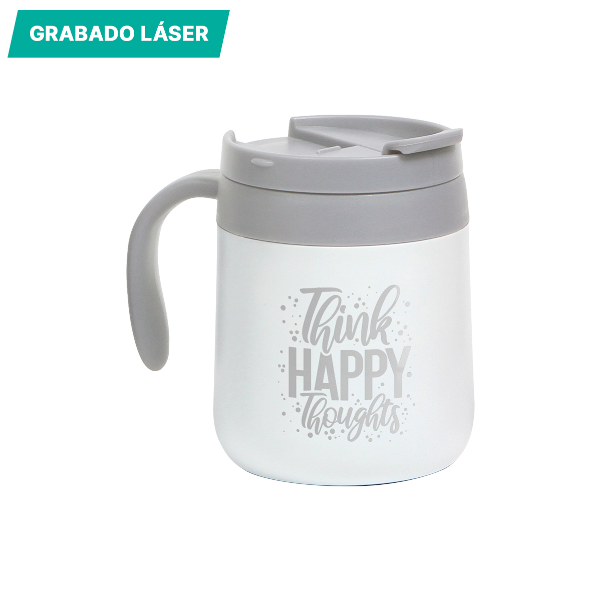 Taza Dávao. - Taza térmica de en acero inoxidable doble pared, con asa y tapa de polipropileno (PP). Fabricado en materiales de grado alimenticio, mantiene bebidas frías o calientes por un largo tiempo, no usar en microondas, capacidad 390 ml. Incluye caja de cartón individual.