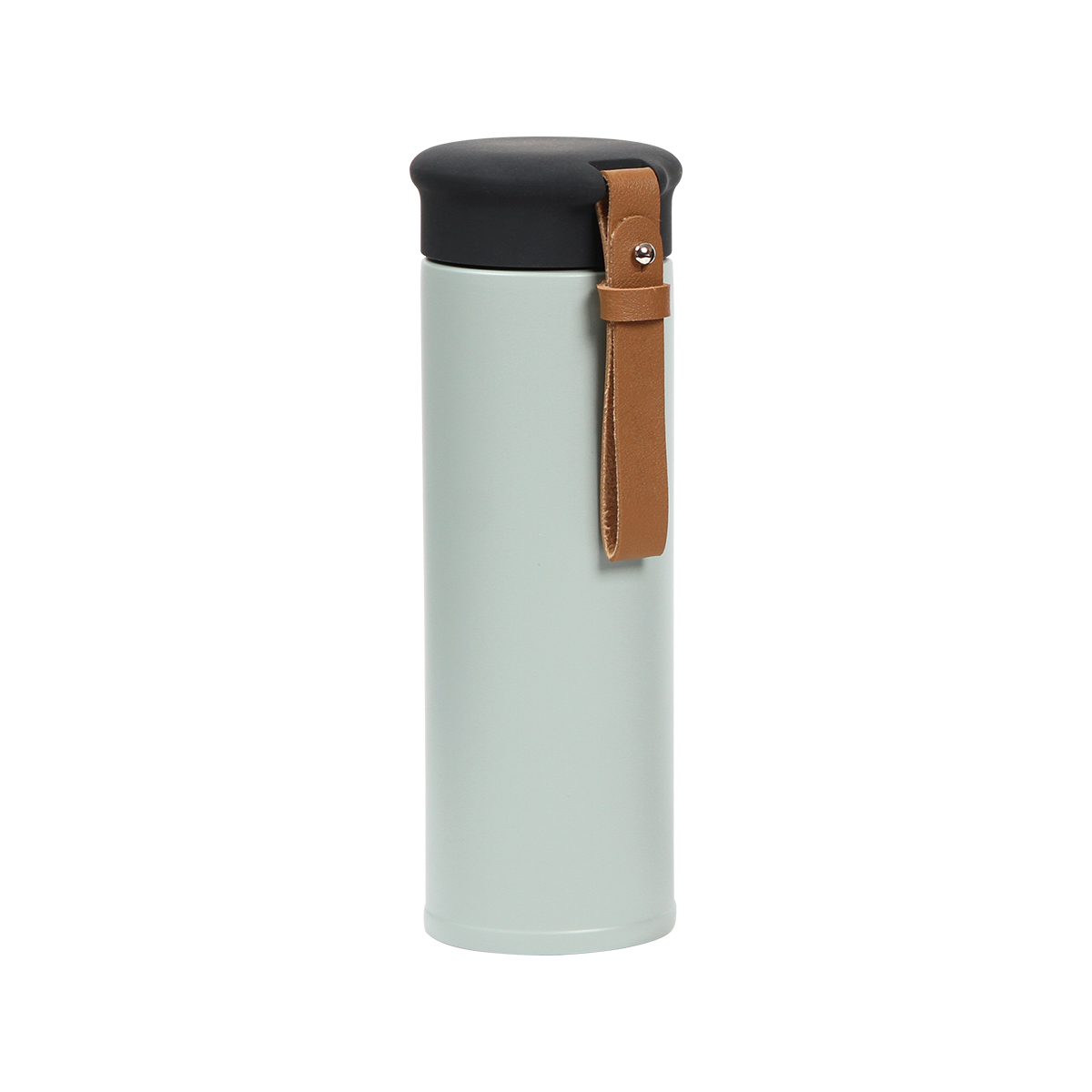 Termo Legazpi. - Termo de acero inoxidable con doble pared, tapa de Acrilonitrilo Butadieno Estireno (ABS), rejilla para té y correa de piel. Fabricado en materiales de grado alimenticio, mantiene bebidas frías o calientes por un largo tiempo, no usar en microondas. Capacidad 450 ml. Incluye caja de cartón individual