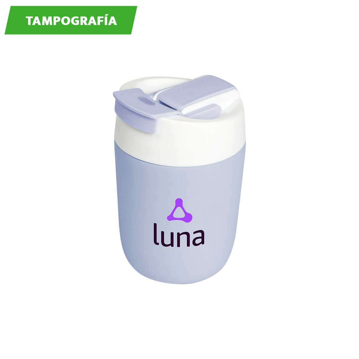 Vaso Cilegon. - Vaso térmico de acero inoxidable doble pared con recubrimiento suave, tapa de Polipropileno y doble tapadera de seguridad y chupete integrado. Fabricado en materiales de grado alimenticio, mantiene bebidas frías o calientes por un largo tiempo. No usar en microondas. Capacidad de 350 ml. Incluye caja de cartón individual.
