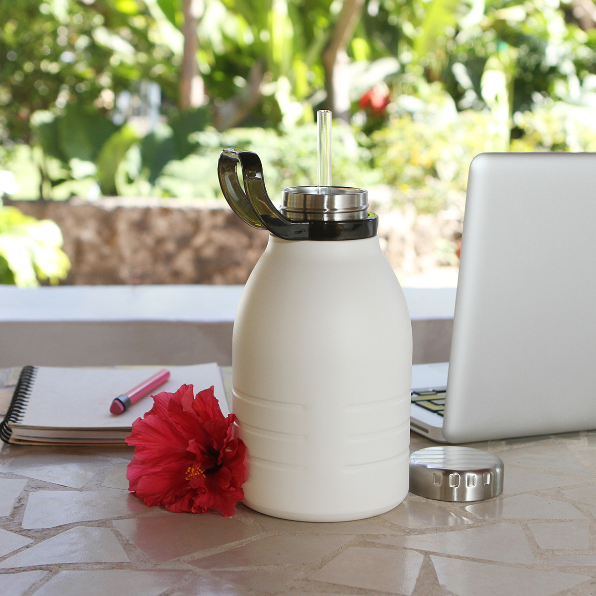 Termo Camicelle. - Termo jumbo de acero inoxidable doble pared con doble tapa de seguridad, tapa interior fabricada en ABS, popote plástico flexible y tapa exterior de acero inoxidable.Cuenta con una manija plástica de diseño ergonómico para su fácil transporte.  Capacidad de 1,500 ml, no usar en microondas, incluye caja individual.