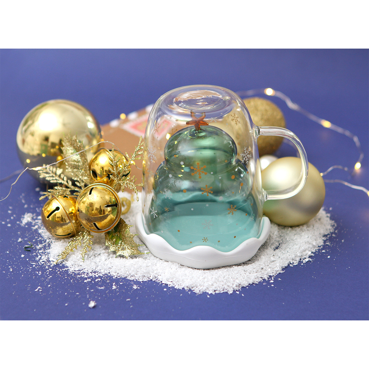 Taza Luena. - Taza fabricada en vidrio, doble pared con diseño de árbol de navidad, incluye base de silicón en forma de nieve, capacidad de 300 ml. Sorprende a tus seres queridos con este regalo inolvidable y único.