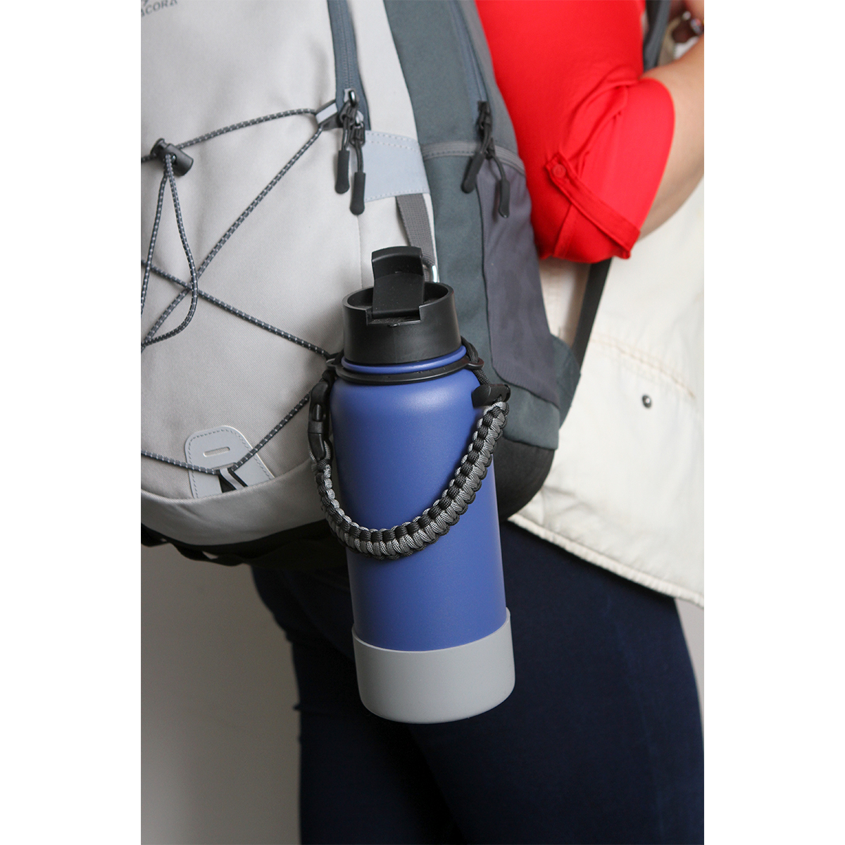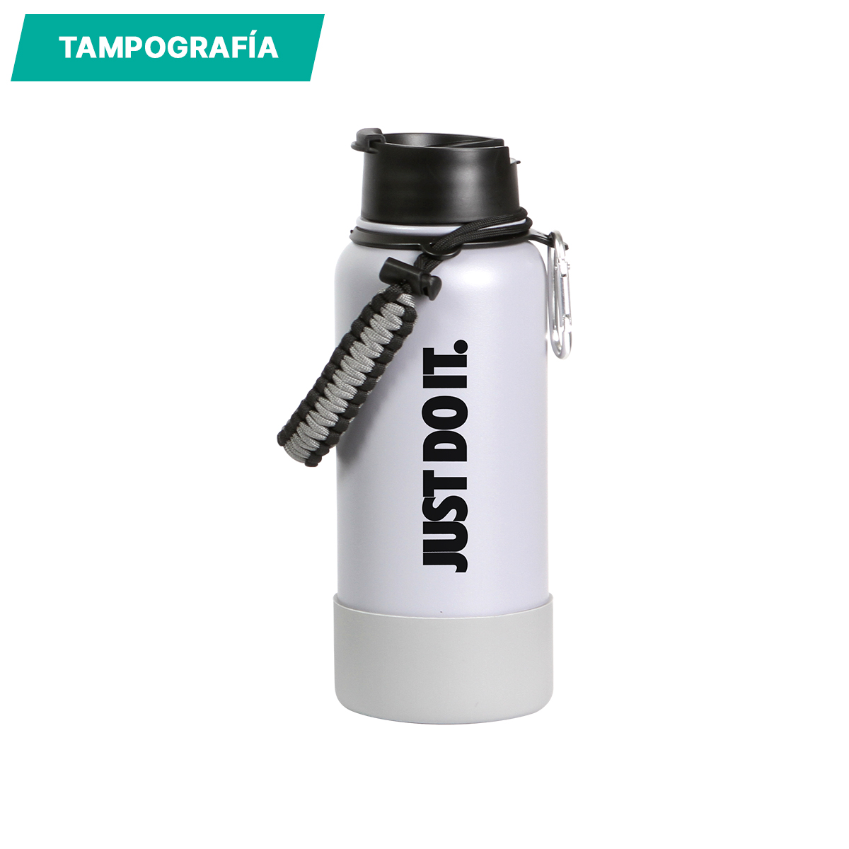 Botella Sarnen. - Botella deportiva, fabricada en acero inoxidable doble pared. Tapa de rosca con boquilla. Cuenta con capacidad de 1,000 ml. Incluye arnés, correa con detalles en gris y base de silicón anti derrapante.