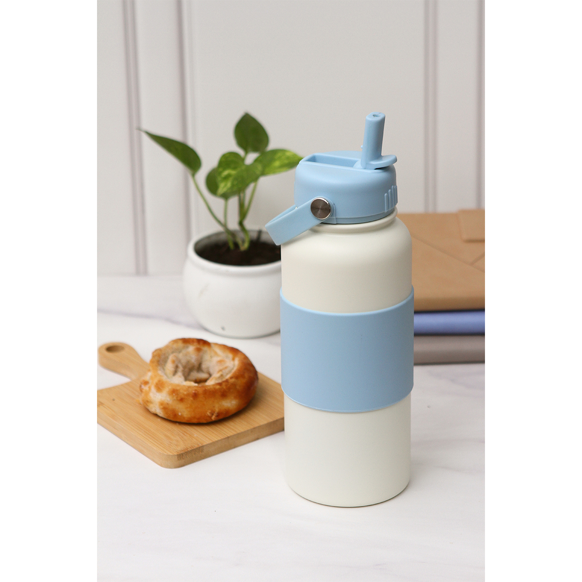 Termo Traun. - Termo de doble pared fabricado en acero inoxidable, con detalles coloridos. Manga de silicón para una mejor manipulación y evitar que se deslice. Incluye una tapa de polipropileno con agarradera fabricada en TPR. Capacidad de 1,000 ml.