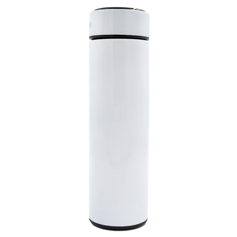 Elegante termo con capacidad de 500 ml fabricado en acero inoxidable grado alimenticio recubierto con pintura para un mejor agarre (excepto color plata). Cuenta con una pantalla digital en la tapa que muestra la temperatura real del líquido (se enciende al tocar la superficie superior de la tapa).