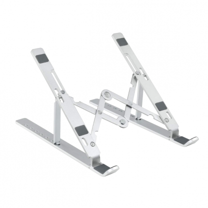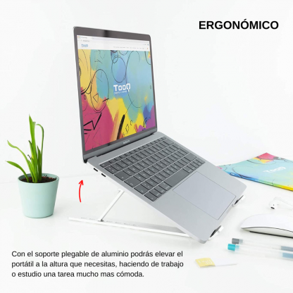 SOPORTE PLEGABLE DE ALUMINIO LAPTOP / TABLETA A diferencia de otros soportes, posee mayor longitud, lo que da más firmeza al equipo que coloques sobre él. Paralelamente, con su uso, evitas el sobrecalentamiento de tu equipo, que queda separado de la superficie, permitiendo una circulación de aire por la base de éste. Este soporte te permite utilizar, sin problemas, el teclado de tu equipo, ya que sus pestañas de sujeción quedan en el lugar preciso para no interferir.