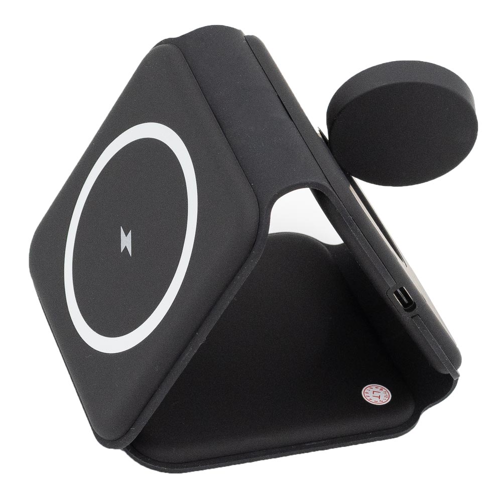 Fabricado en silicona con imanes incrustados y su diseño en pliegues hacen fácil el transportarlo y en segundos pasar de una posición de 180° a soporte de visualización de videos.”