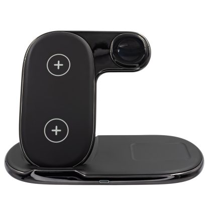 ESTACION DE CARGA INALÁMBRICA EXECUTIVE. Estación de carga inalámbrica portátil 3 en 1 (smartphone, smartwatch y auriculares) en color negro con acabados cromo-negro, doble zona de carga para smartphone. Compatibilidad Dispositivo y/o gadgets que cumplan con el estandar Qi. Especificaciones -Requiere adaptador de carga 9v-2A, 5v-3A -Rango de transmisión: 10 mm -Poder de Carga: smartphone: 15w, auriculares: 3w y smartwatch: 2.5w -Interface: USB Tipo C Incluye 1 Manual y 1 cable USB tipo C