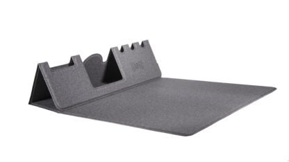 Mouse pad multifuncional con carga inalámbrica: plegable e impermeable, cuenta con soporte para tarjetas y teléfono, bandeja para bolígrafos, interfaz de carga y superficie de precisión para el mouse.