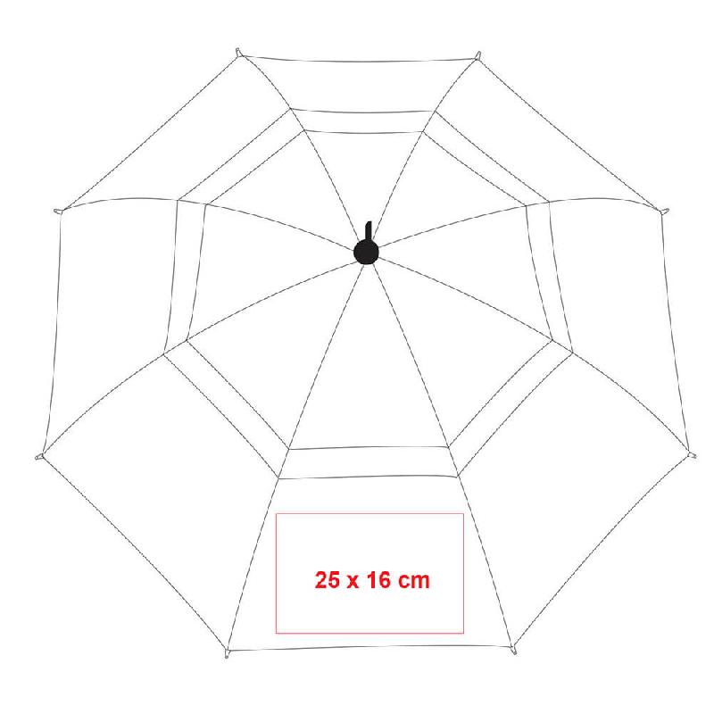 Paraguas con doble faldón. Medidas: 95 x 124 cm Material: Poliester y acero. Empaque: Bolsa de celofán.